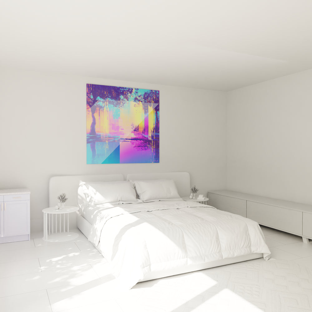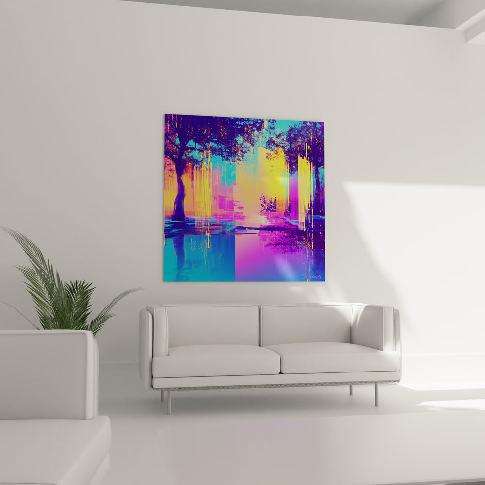 La composition de ce tableau paysage digital coloré s'articule autour d'un équilibre parfait entre les éléments naturels et leur transcription numérique. Les arbres occupent stratégiquement les parties latérales du cadre, créant un cadrage naturel qui guide le regard vers le centre lumineux de l'œuvre. La perspective adopte un point de vue légèrement surélevé, permettant d'apprécier simultanément la canopée digitalisée et les reflets aquatiques transformés. L'espace est divisé harmonieusement entre la partie terrestre avec sa végétation stylisée et la zone aquatique qui occupe le tiers inférieur, créant une profondeur visuelle remarquable. Cette art mural paysage futuriste utilise les proportions classiques du paysage tout en les réinventant.