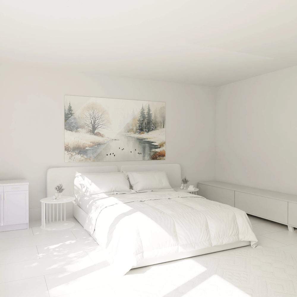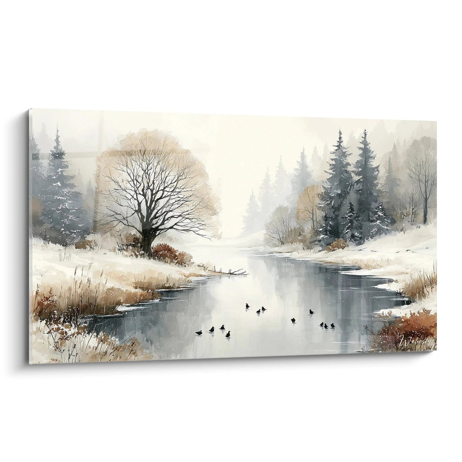 La composition de ce tableau paysage hivernal brumeux s'articule autour d'une ligne d'horizon basse qui laisse dominer le ciel voilé. La rivière guide naturellement le regard vers le fond de la scène, créant une perspective fluide renforcée par les berges enneigées. L'arbre dépouillé situé à gauche fait office de point d'ancrage visuel, équilibré par la masse sombre des conifères sur la droite. Cette décoration murale paysage hivernal exploite habilement la règle des tiers avec les canards positionnés dans le tiers inférieur. Les masses végétales créent un rythme visuel harmonieux, alternant entre zones claires enneigées et ombres douces. L'espace négatif du ciel brumeux occupe une place prépondérante, accentuant la sensation d'immensité caractéristique des paysages hivernaux nordiques.