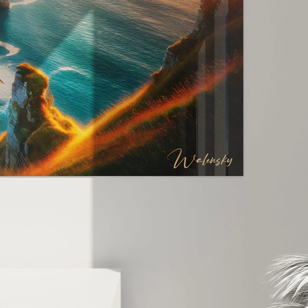 Imaginez-vous plongé au sommet de falaises majestueuses, là où l’océan s’étend à perte de vue et où la lumière dorée du coucher du soleil embrase l’horizon. Ce tableau saisit cet instant précieux, capturant la rencontre puissante entre la terre, le ciel et la mer. Plus qu’une simple décoration, cette œuvre est une invitation à ressentir la grandeur sauvage du naturel, directement depuis votre intérieur.