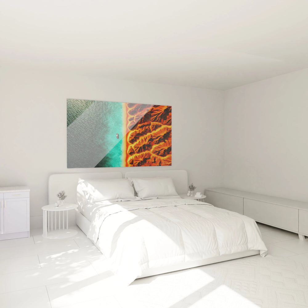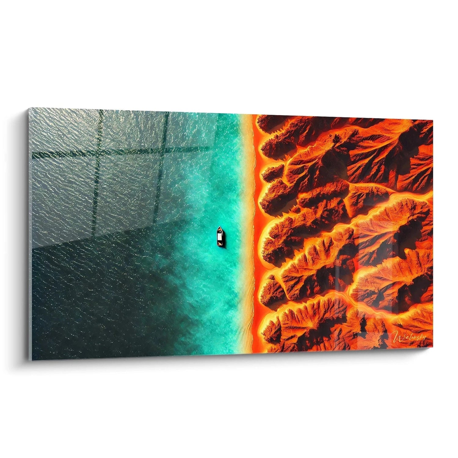 Imaginez un instant où le murmure de l’océan rencontre la chaleur ardente de la terre, où un bateau solitaire glisse doucement entre ces deux mondes en contraste vibrant. Ce tableau paysage idyllique est une œuvre d’art qui transcende la simple décoration pour devenir une véritable expérience sensorielle et émotionnelle dans votre intérieur.