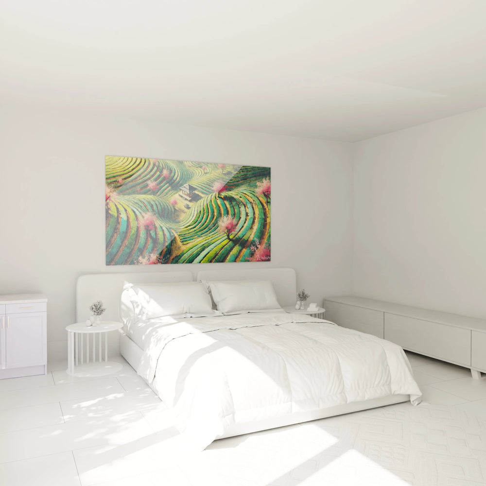 Ce tableau délicat vous invite à explorer les rizières en terrasses, dessinées avec une grâce naturelle qui évoque une danse silencieuse entre la terre et le ciel. Le pavillon niché au centre agit comme un havre de paix, appelant à une pause méditative, tandis que les cerisiers en fleurs distillent une fraîcheur poétique, rappelant la fragilité merveilleuse de chaque instant.