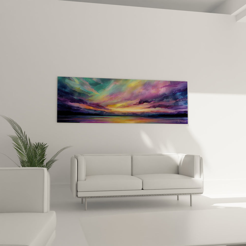 Tags : tableau aurore boréale, paysage nordique, art cosmique, décoration lac, peinture panoramique