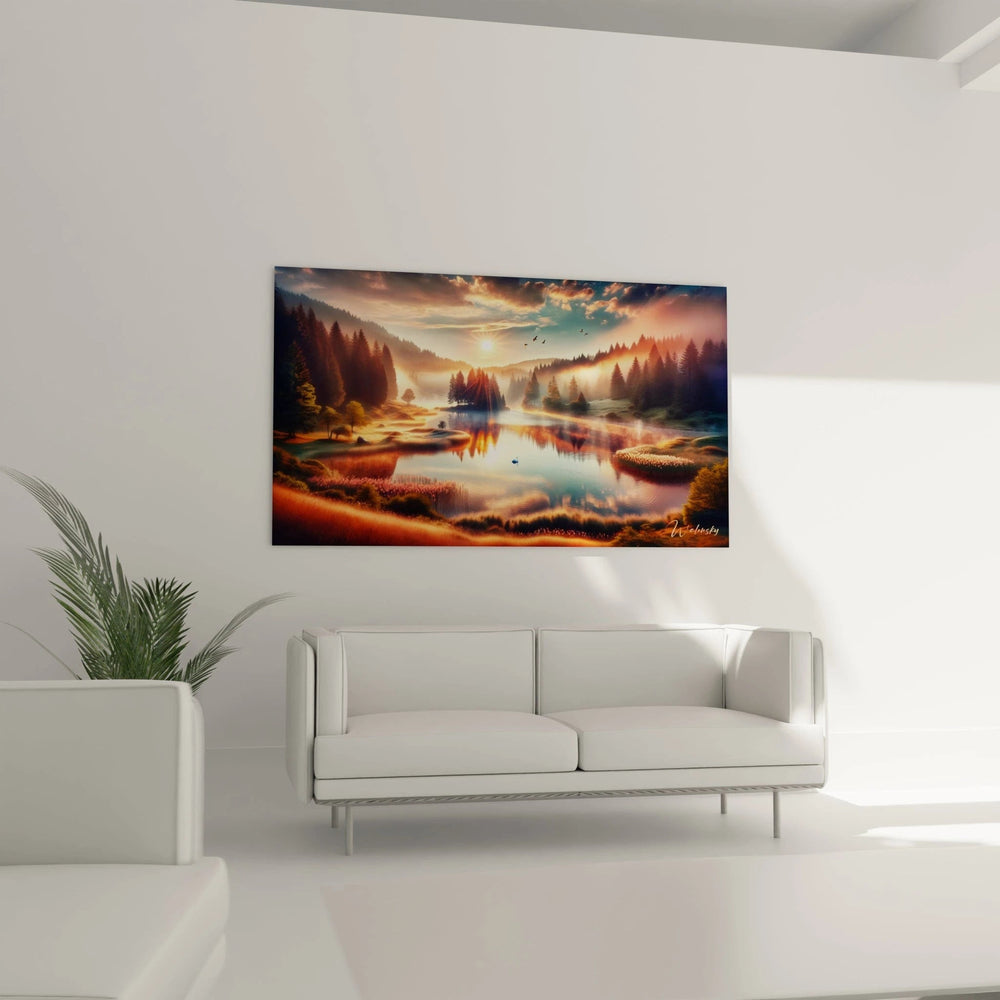 Imaginez-vous face à un paysage où chaque rayon de soleil vient caresser délicatement la surface d’un lac paisible, créant un scintillement unique, presque hypnotique. Ce Tableau vous offre cette évasion, un instant suspendu entre la fraîcheur matinale et la clarté d’une nature intacte, à portée de main.