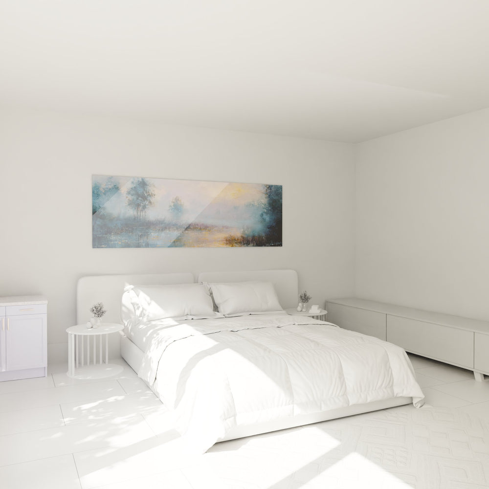 Ce tableau mural lac capture avec une délicatesse remarquable l'atmosphère mystérieuse d'un paysage lacustre enveloppé de brume matinale. L'artiste déploie une technique impressionniste pour représenter cette scène lacustre brumeuse où l'eau calme reflète les nuances poudrées du ciel. Les arbres silhouettes émergent timidement de la brume, créant une composition équilibrée entre terre et eau. Cette peinture lac impressionniste révèle un moment suspendu où la nature semble retenir son souffle. Les reflets dorés sur l'eau suggèrent les premiers rayons du soleil perçant la brume, apportant une dimension poétique à ce tableau lac moderne. La technique de superposition des couleurs crée une profondeur atmosphérique saisissante, transformant cette toile paysage lacustre en une invitation à la contemplation. Les transitions colorées fluides entre les différents plans renforcent l'impression d'immersion dans ce décor mural lac paisible. Cette œuvre témoigne d'une maîtrise artistique où chaque nuance participe à l'harmonie générale de cette représentation lac artistique.