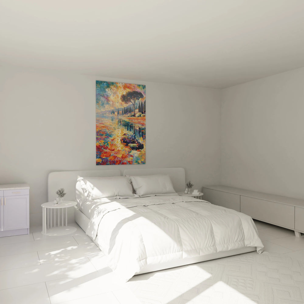 Cette décoration murale paysage lacustre s'épanouit particulièrement dans des espaces baignés de lumière naturelle qui révèlent toute la richesse de sa palette chromatique. Un salon aux tons neutres permettrait aux couleurs vives de s'exprimer pleinement sans concurrence visuelle. L'éclairage LED blanc chaud magnifierait les tons dorés et orangés tout en préservant la fraîcheur des bleus. Cette œuvre paysage décorative s'harmoniserait parfaitement avec un mobilier aux lignes épurées et des textiles dans des tons complémentaires. Un mur blanc ou beige constituerait l'écrin idéal pour cette composition colorée. L'association avec des plantes vertes créerait un dialogue intéressant entre nature réelle et interprétée, renforçant l'atmosphère méditerranéenne de l'ensemble.