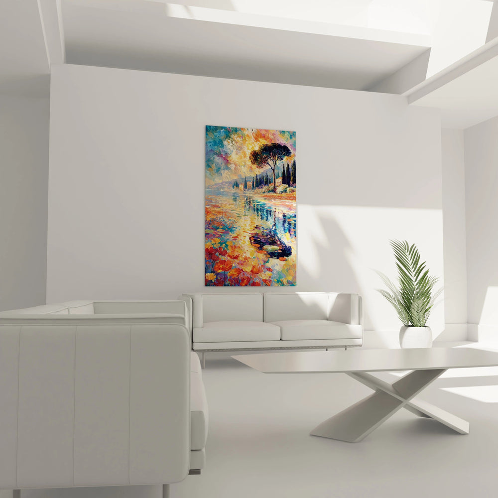Cette œuvre paysage lacustre captive immédiatement par ses reflets chatoyants qui dansent à la surface de l'eau. Le tableau paysage lacustre présente une composition harmonieuse où un arbre majestueux se dresse sur la rive, créant une silhouette distinctive contre un ciel aux nuances flamboyantes. Les couleurs vives et contrastées transforment cette scène naturelle en une véritable symphonie visuelle. Cette décoration murale paysage lacustre révèle une technique pointilliste sophistiquée où chaque point de couleur contribue à l'ensemble. L'artiste a su capturer l'essence méditerranéenne du lieu avec une précision remarquable, faisant de cette œuvre un élément décoratif exceptionnel.