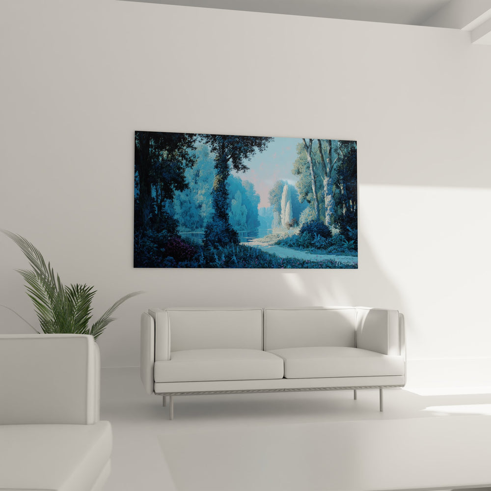 Ce tableau mural lac présente un paysage lacustre enchanteur baigné dans une atmosphère mystique et vaporeuse. L'œuvre dépeint une scène naturelle où un lac paisible s'étend au centre de la composition, entouré d'une végétation luxuriante aux tons bleutés. Les arbres majestueux, aux silhouettes élancées et aux feuillages denses, créent un écrin naturel autour de cette étendue d'eau sereine. La lumière filtrée traverse délicatement la canopée, projetant des reflets dorés sur la surface de l'eau et illuminant subtilement le sentier qui serpente le long de la berge. Cette représentation artistique de lac capture parfaitement l'essence d'un moment suspendu dans le temps, où la nature révèle toute sa splendeur. Le tableau décoratif paysage aquatique invite à la contemplation et à l'évasion, transportant l'observateur dans un univers où règnent calme et sérénité. La technique picturale employée révèle une maîtrise remarquable des jeux d'ombres et de lumières, créant une profondeur saisissante qui donne vie à cette scène lacustre contemplative. Chaque détail, des reflets chatoyants sur l'eau aux variations subtiles de la végétation, contribue à l'harmonie générale de cette œuvre d'art murale nature.