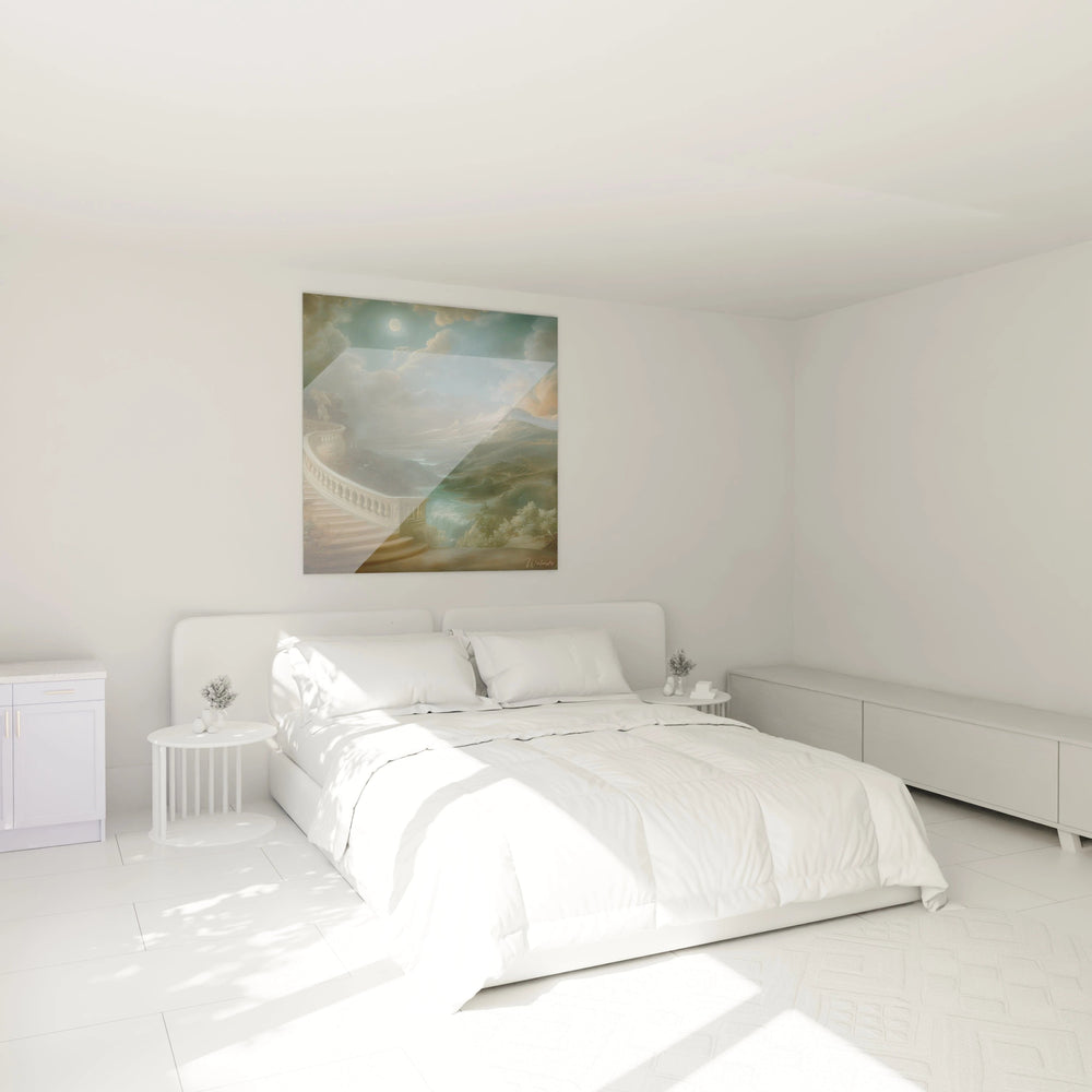 Cette art mural paysage atmosphérique révèle une harmonie de tons froids qui évoque la sérénité et le mystère. L'impact émotionnel procède de cette palette apaisante qui invite à la méditation contemplative.