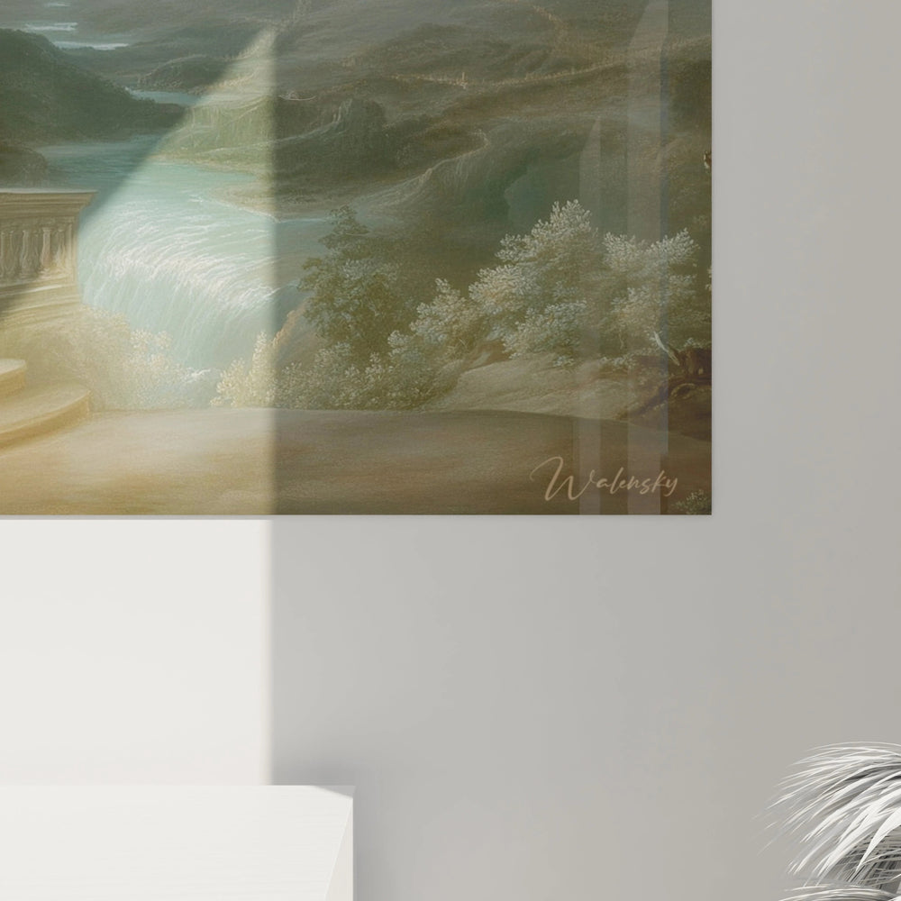 L'unicité de ce tableau paysage balustrade ornée réside dans sa capacité à fusionner architecture et nature dans une vision poétique intemporelle. Les détails sculpturaux de la balustrade présentent des motifs floraux et géométriques impossibles à reproduire mécaniquement. Le positionnement particulier de la lune crée un éclairage théâtral qui transforme le paysage en décor d'opéra. Les reflets argentés sur la rivière serpentant dans la vallée ajoutent une dimension narrative à la scène. Cette art mural romantique se distingue par son atmosphère de recueillement mystique, où chaque élément visuel contribue à créer une expérience contemplative unique. La signature artistique visible confirme l'authenticité de cette vision personnelle du sublime romantique.
