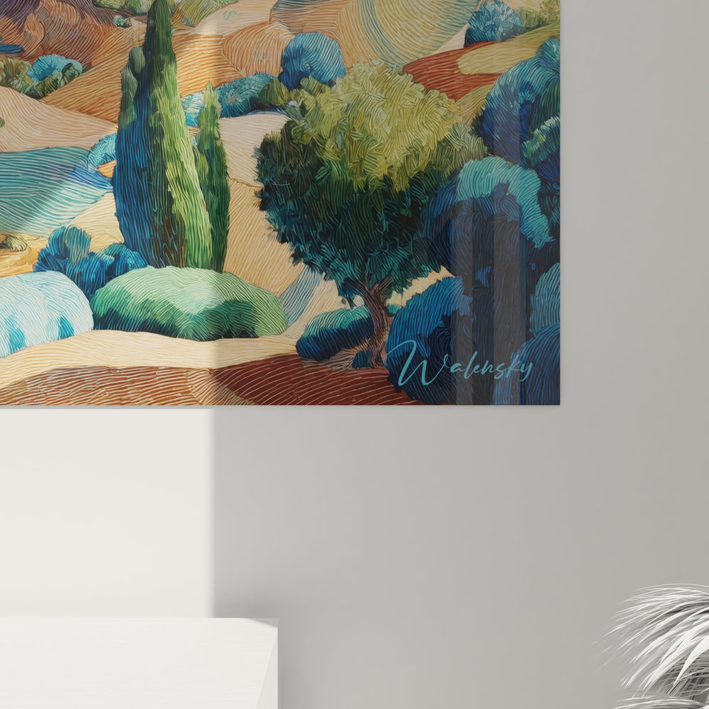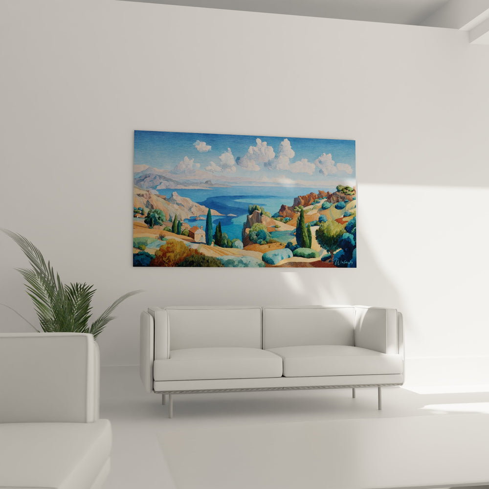 La palette chromatique de ce tableau décoratif bord de mer évoque la sérénité et la douceur de vivre méditerranéenne. Les tons ocre et dorés des terres contrastent harmonieusement avec le bleu intense de la mer, créant une atmosphère apaisante et chaleureuse. Les cyprès symboles d'éternité s'élancent vers le ciel, représentant la connexion entre terre et mer, tandis que les nuages cotonneux symbolisent la légèreté et l'évasion spirituelle.