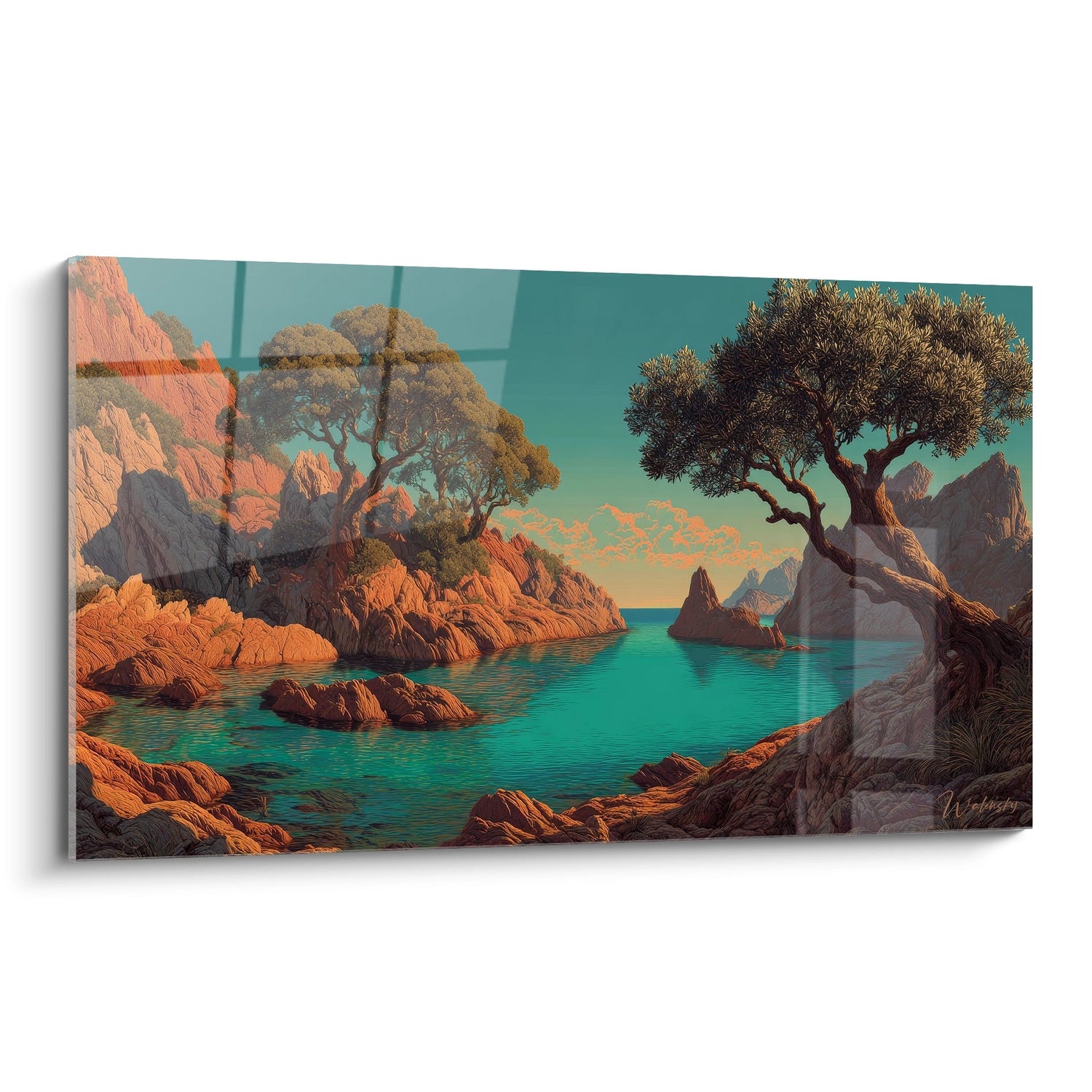Ce tableau mural paysage marin capture la beauté saisissante d'une crique méditerranéenne baignée de lumière dorée. L'œuvre dévoile un panorama côtier d'exception où les eaux turquoise cristallines contrastent harmonieusement avec les falaises ocre et les rochers sculptés par le temps. Au premier plan, un olivier centenaire aux branches tortueuses s'élève majestueusement, ses feuilles argentées captant les derniers rayons du soleil couchant. Cette décoration murale bord de mer transporte l'observateur dans un univers méditerranéen authentique, où la nature sauvage révèle ses plus beaux secrets. Les formations rocheuses aux tons chauds d'ocre et de terracotta émergent des eaux turquoise méditerranéennes, créant un jeu de reflets enchanteur. L'arrière-plan dévoile des montagnes aux silhouettes douces qui se perdent dans une brume dorée, évoquant la sérénité des fins d'après-midi sur la Côte d'Azur. Ce tableau décoratif paysage côtier sublime l'art de vivre méditerranéen à travers une composition équilibrée où chaque élément naturel trouve sa place. L'ensemble respire la quiétude et l'évasion, transformant instantanément votre intérieur en havre de paix maritime.