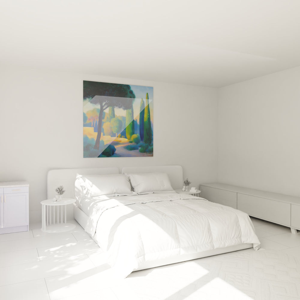 Chaque regard posé sur ce tableau éveille des sensations de sérénité et de chaleur. La lumière dorée qui baigne les cyprès exhale une atmosphère apaisante, rappelant les longues journées d'été où l'air marin se mêle à la douce odeur des pins. C'est comme si vous pouviez entendre le doux murmure des vagues et ressentir la brise légère tout en restant confortablement installé chez vous.