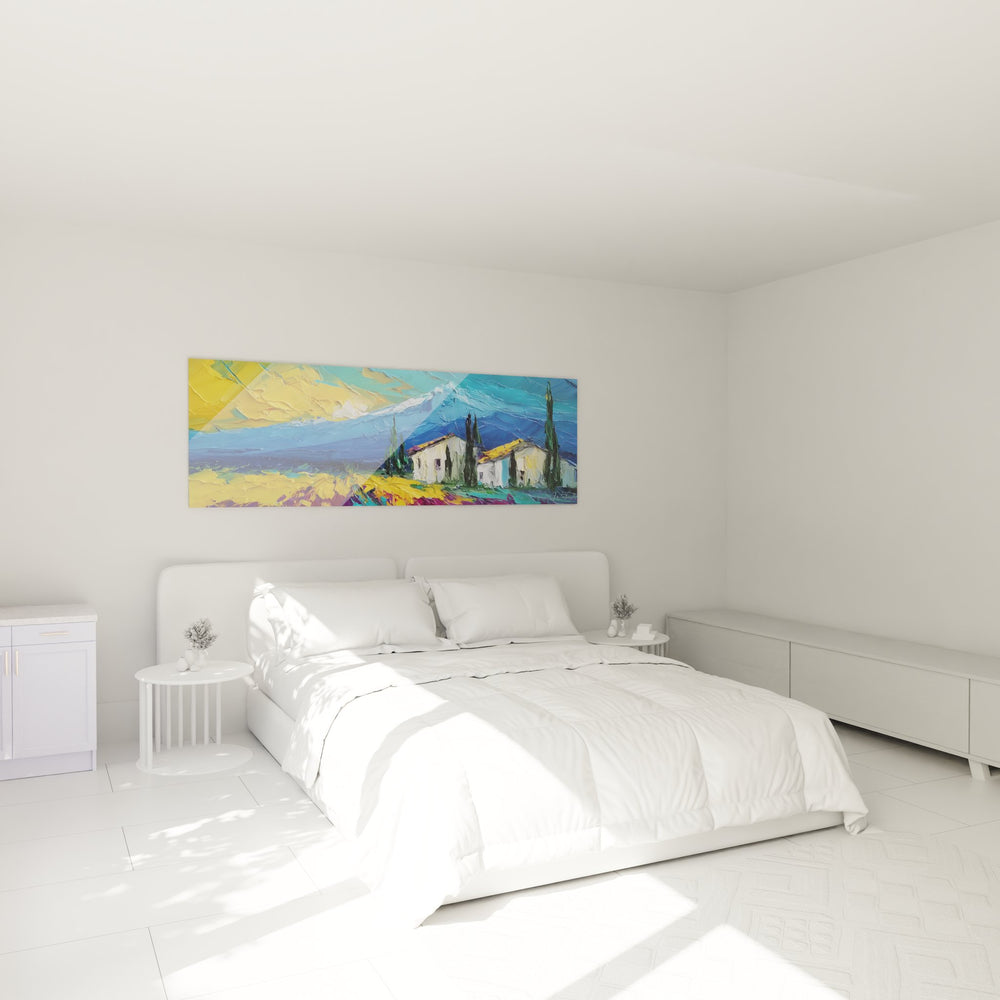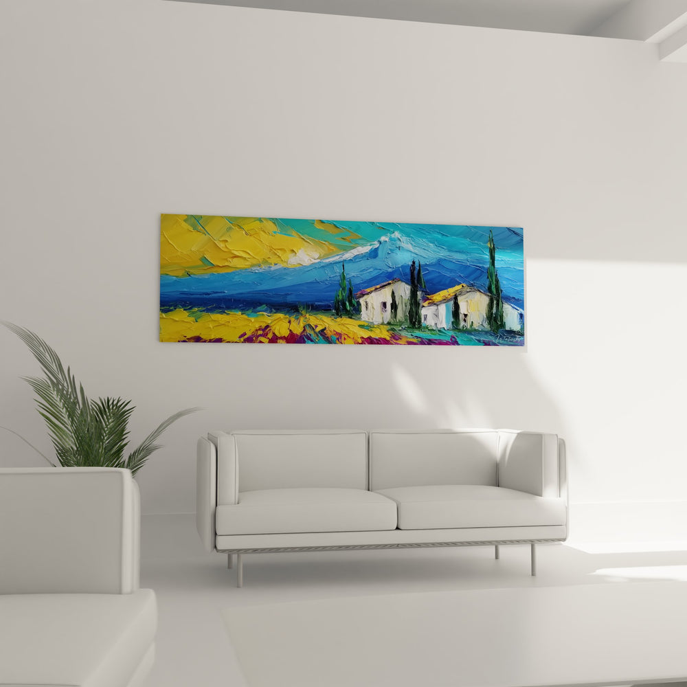 Ce magnifique tableau mural paysage méditerranéen capture l'essence d'une campagne provençale sous un ciel volcanique dramatique. L'œuvre présente deux maisons blanches traditionnelles aux toits de tuiles ocre, nichées au cœur d'un paysage baigné de lumière dorée. Des cyprès élancés se dressent majestueusement entre les habitations, créant une composition verticale qui contraste harmonieusement avec l'horizontalité du terrain. Le tableau art impressionniste volcanique révèle une technique de pâte épaisse caractéristique, où chaque coup de pinceau apporte texture et mouvement à la scène. Les champs colorés méditerranéens s'étendent en premier plan, ponctués de touches violettes et pourpres qui évoquent les lavandes provençales. La peinture paysage volcanique moderne transforme ce décor bucolique en une vision dramatique grâce aux nuages orageux qui dominent la composition. Les montagnes bleues se profilent à l'horizon, créant une profondeur saisissante qui invite le regard à voyager à travers cette toile décorative paysage volcanique. Cette œuvre contemporaine réinterprète les codes de la peinture de paysage classique en y insufflant une énergie volcanique palpable.