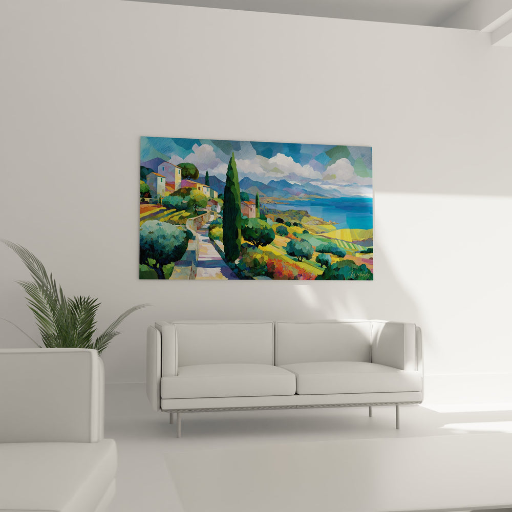Tags : tableau village méditerranéen, art mural bord de mer, paysage côtier décoratif, cyprès peinture, décoration méditerranéenne