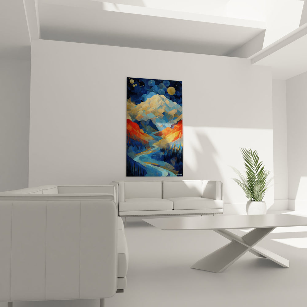 Ce tableau mural montagne présente une vision onirique et contemporaine d'un paysage montagnard stylisé. L'œuvre dévoile des sommets majestueux aux formes géométriques fragmentées, baignés dans une atmosphère cosmique fascinante. Au premier plan, une rivière serpentine bleue traverse une vallée sombre ponctuée de silhouettes d'arbres stylisés, créant une profondeur saisissante. Les montagnes centrales, illuminées par des tons dorés et ocres, contrastent harmonieusement avec le ciel nocturne parsemé d'orbes célestes. Cette décoration murale montagne moderne transforme l'espace traditionnel du paysage alpin en une composition artistique audacieuse. L'artiste a su capturer l'essence mystique de la haute montagne tout en y intégrant une dimension cosmique unique. Les multiples couches de couleurs superposées créent un effet de transparence et de mouvement qui anime l'ensemble de la composition. Ce tableau contemporain paysage alpin s'inscrit parfaitement dans une démarche artistique moderne, où la nature rencontre l'abstraction géométrique. L'œuvre invite à la contemplation et au voyage imaginaire à travers ses reliefs fragmentés et sa palette chromatique envoûtante.