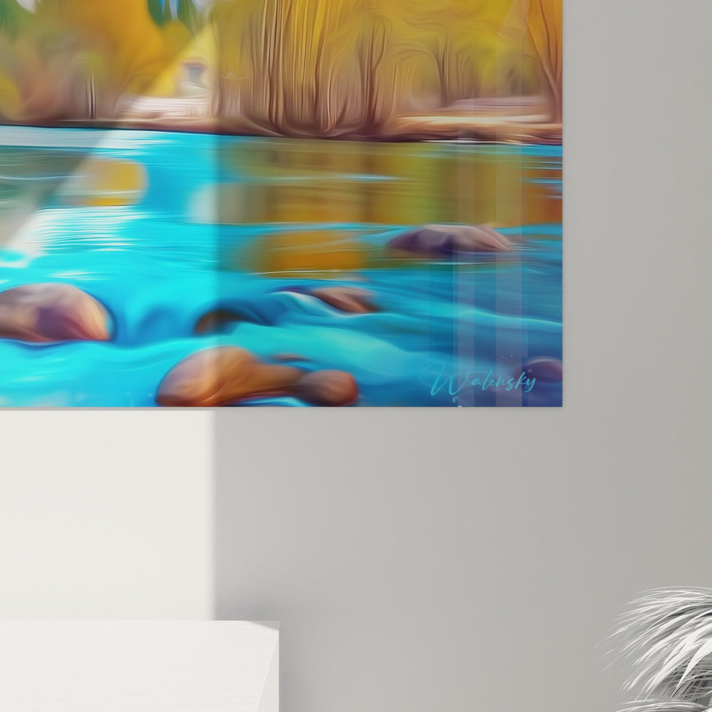 Cette œuvre d'art numérique présente un tableau cascade spectaculaire dans un environnement montagneux stylisé. La composition révèle une cascade majestueuse qui s'élance depuis les hauteurs rocheuses, créant un rideau d'eau cristallin au centre de la toile. Les formations géologiques sont rendues avec un style artistique fluide qui accentue les courbes naturelles des falaises colorées. Au premier plan, une rivière paisible reflète fidèlement les couleurs environnantes, parsemée de rochers polis qui émergent délicatement de la surface. La végétation luxuriante se compose d'arbres aux feuillages automnaux dorés qui contrastent harmonieusement avec les tons froids des roches. Ce tableau mural cascade capture l'essence d'une vallée préservée où la nature s'exprime dans toute sa splendeur. L'artiste a privilégié une technique de rendu qui évoque la fluidité et le mouvement, créant une œuvre d'art paysage qui semble vibrer de vie. Les jeux de lumière naturelle illuminent différemment chaque élément, des sommets rocheux jusqu'aux reflets aquatiques, offrant une profondeur visuelle remarquable à cette décoration murale nature.