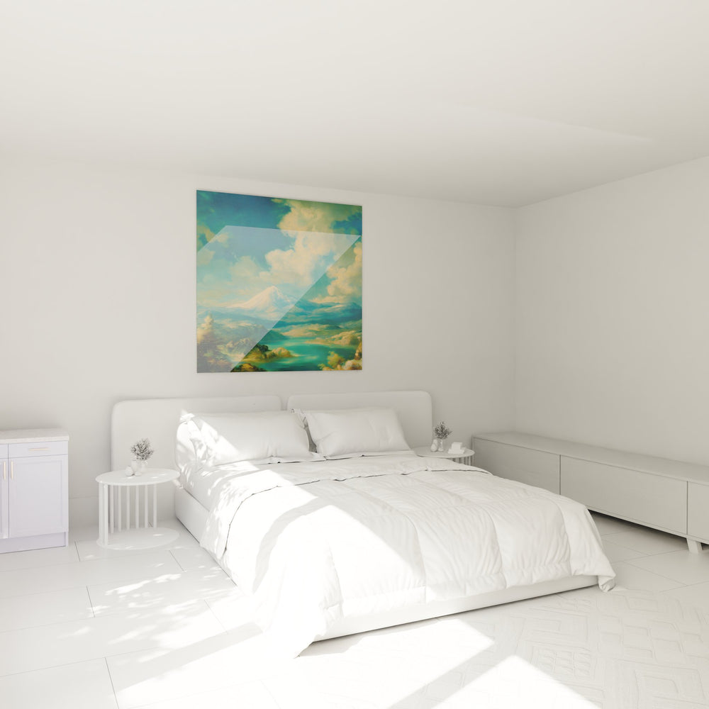 Tags : tableau volcan, paysage montagneux, décoration volcanique, art mural turquoise, tableau vintage
