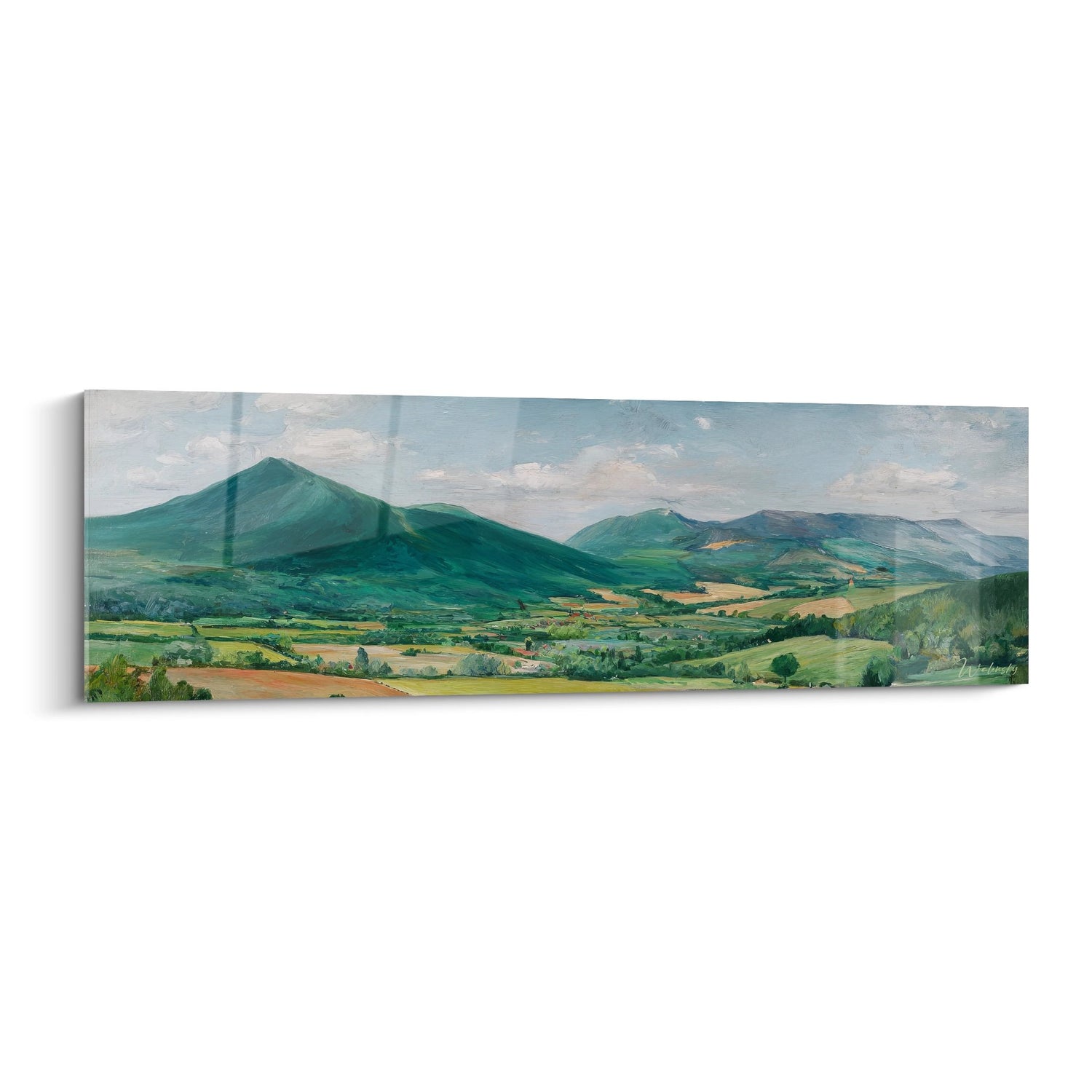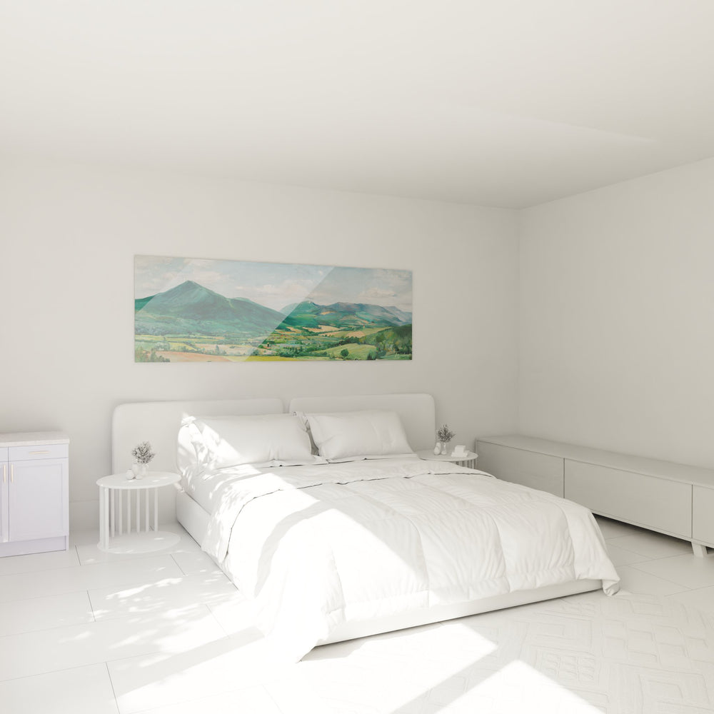 Ce magnifique tableau mural paysage montagneux offre une vue panoramique saisissante sur une vallée verdoyante nichée entre des collines majestueuses. L'œuvre capture avec finesse la beauté naturelle d'un paysage de campagne où se mélangent harmonieusement les tons verts profonds des montagnes et les nuances dorées des champs cultivés. Les collines boisées s'étendent à l'horizon, créant un relief ondulant qui guide le regard vers les sommets bleutés. Cette peinture de vallée pastorale révèle un patchwork de terres agricoles parsemées de bosquets et de prairies, témoignant de l'activité humaine en harmonie avec la nature. Le ciel partiellement nuageux apporte une dimension atmosphérique à cette représentation de paysage rural, où la lumière naturelle vient caresser les versants et illuminer la plaine fertile. Cette œuvre murale nature montagnarde transformera votre espace en fenêtre ouverte sur la sérénité champêtre, invitant à la contemplation et à l'évasion vers ces terres agricoles préservées où règne encore l'authenticité.