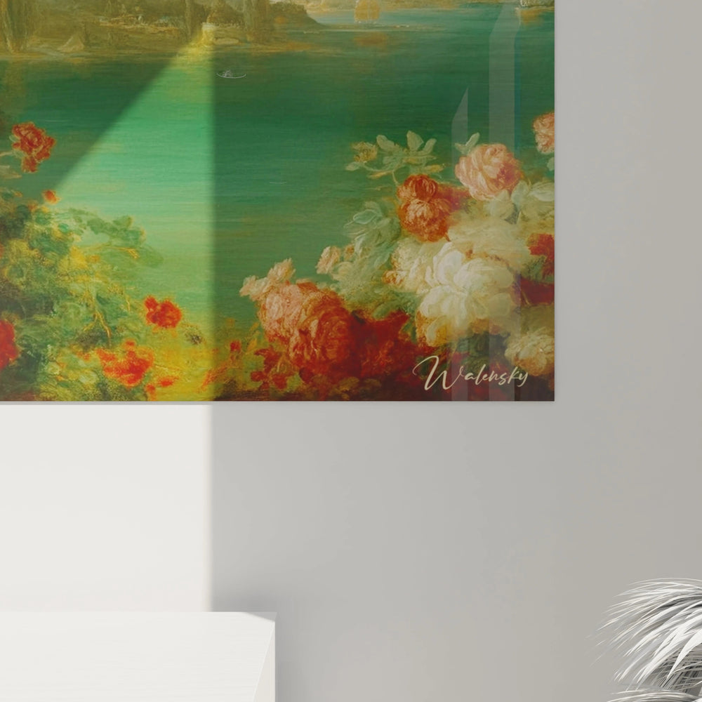 L'observation rapprochée de cette œuvre paysage détails minutieux révèle une richesse insoupçonnée dans les micro-détails. Chaque pétale de rose présente des nuances colorées subtiles qui ne se dévoilent qu'à l'examen attentif, tandis que la texture des feuillages montre des variations de tons d'un raffinement extrême. À distance, ce tableau paysage effet global offre une vision d'ensemble harmonieuse où tous les éléments se fondent dans une unité parfaite. Les voiliers sur le lac, à peine suggérés, prennent toute leur importance dans la lecture générale de l'œuvre. Cette décoration murale paysage perspectives multiples change d'aspect selon l'angle d'observation, révélant tantôt la dominante florale, tantôt l'ampleur du paysage. La magie de ce tableau paysage changement visuel réside dans cette capacité à offrir plusieurs lectures selon la distance d'observation.