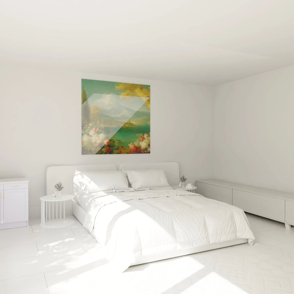 Cette œuvre d'art présente un tableau paysage floral d'une beauté saisissante, mêlant harmonieusement éléments naturels et composition raffinée. Au premier plan, des roses aux teintes délicates - blanc nacré, rose tendre et rouge vermillon - s'épanouissent dans un arrangement naturel qui capture immédiatement l'attention. Cette décoration murale paysage romantique dévoile une perspective profonde vers un lac aux eaux turquoise, bordé de montagnes brumeuses qui s'estompent dans un ciel nuageux aux tons vert d'eau. L'artiste a créé une œuvre paysage pastoral où chaque détail contribue à une atmosphère de sérénité absolue. Les cyprès élancés et la végétation luxuriante encadrent cette scène bucolique, créant un tableau paysage roses romantique empreint de douceur nostalgique.