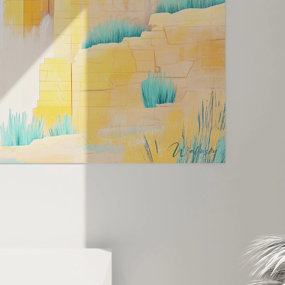 Ce tableau paysage abstrait révèle une composition harmonieuse entre formations rocheuses dorées et végétation turquoise stylisée. L'œuvre présente un équilibre visuel remarquable avec ses tons chauds d'ocre et d'ambre qui dominent la partie supérieure, contrastant élégamment avec les touches de bleu-vert émeraude dispersées dans la composition. Cette décoration murale paysage contemporain capture l'essence d'un environnement désertique abstrait où la lumière joue un rôle central. Les formes géométriques suggèrent des stratifications rocheuses naturelles, créant une profondeur visuelle captivante qui transforme l'espace d'exposition.