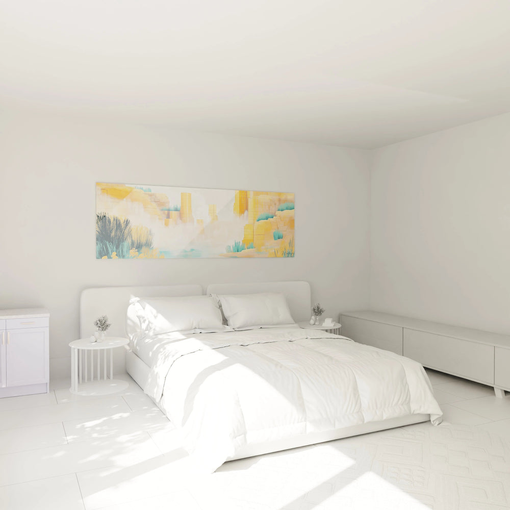 L'originalité de cette œuvre réside dans sa capacité à évoquer un paysage désertique tout en maintenant une approche résolument abstraite. Les formes géométriques stylisées des rochers s'harmonisent parfaitement avec la représentation organique de la végétation. Cette art mural paysage minimaliste se distingue par son format panoramique qui amplifie l'effet d'immersion. L'utilisation stratégique de l'espace blanc comme élément compositeur différencie cette création des œuvres paysagères traditionnelles. La synthèse entre réalisme suggéré et abstraction géométrique crée une identité visuelle impossible à reproduire, positionnant cette œuvre dans un registre artistique contemporain sophistiqué.