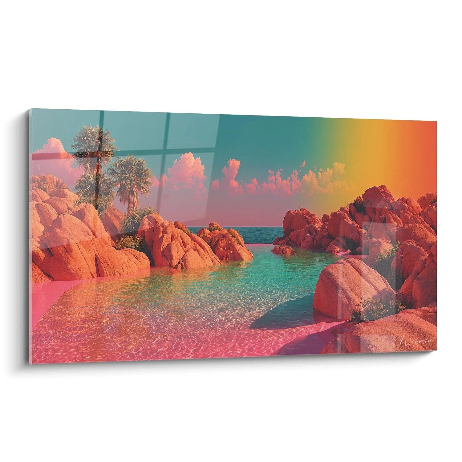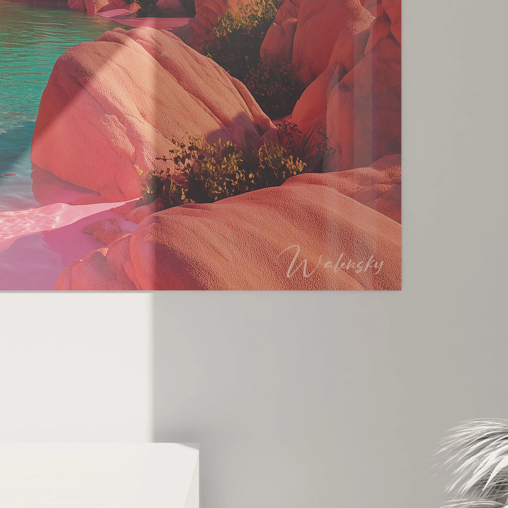 Cette œuvre captivante présente un tableau paysage tropical aux tonalités extraordinaires qui transforme instantanément l'espace. Les formations rocheuses corail dominent la composition, créant un contraste saisissant avec les eaux turquoise cristallines qui serpentent entre les masses minérales. Les palmiers tropicaux se dressent majestueusement sur la gauche, leurs frondaisons sombres contrastant avec le ciel multicolore. Cette décoration murale paysage exotique révèle immédiatement son caractère distinctif par ses nuances roses, oranges et violettes qui évoquent un coucher de soleil permanent. L'harmonie entre les éléments naturels - rochers sculptés, végétation luxuriante et eaux limpides - crée une atmosphère paradisiaque unique.