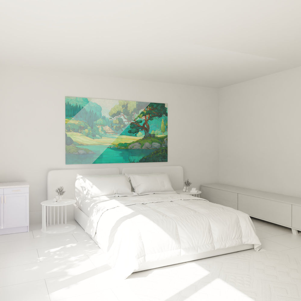 Cette œuvre s'inscrit dans la tradition des paysages contemplatifs inspirés de l'art japonais et de l'école de Barbizon. Elle évoque les travaux de Corot par sa poésie bucolique et rappelle l'esthétique des estampes d'Hiroshige par son traitement stylisé de la nature. Cette interprétation moderne du paysage classique séduira les amateurs d'art décoratif recherchant une ambiance zen et naturelle.
