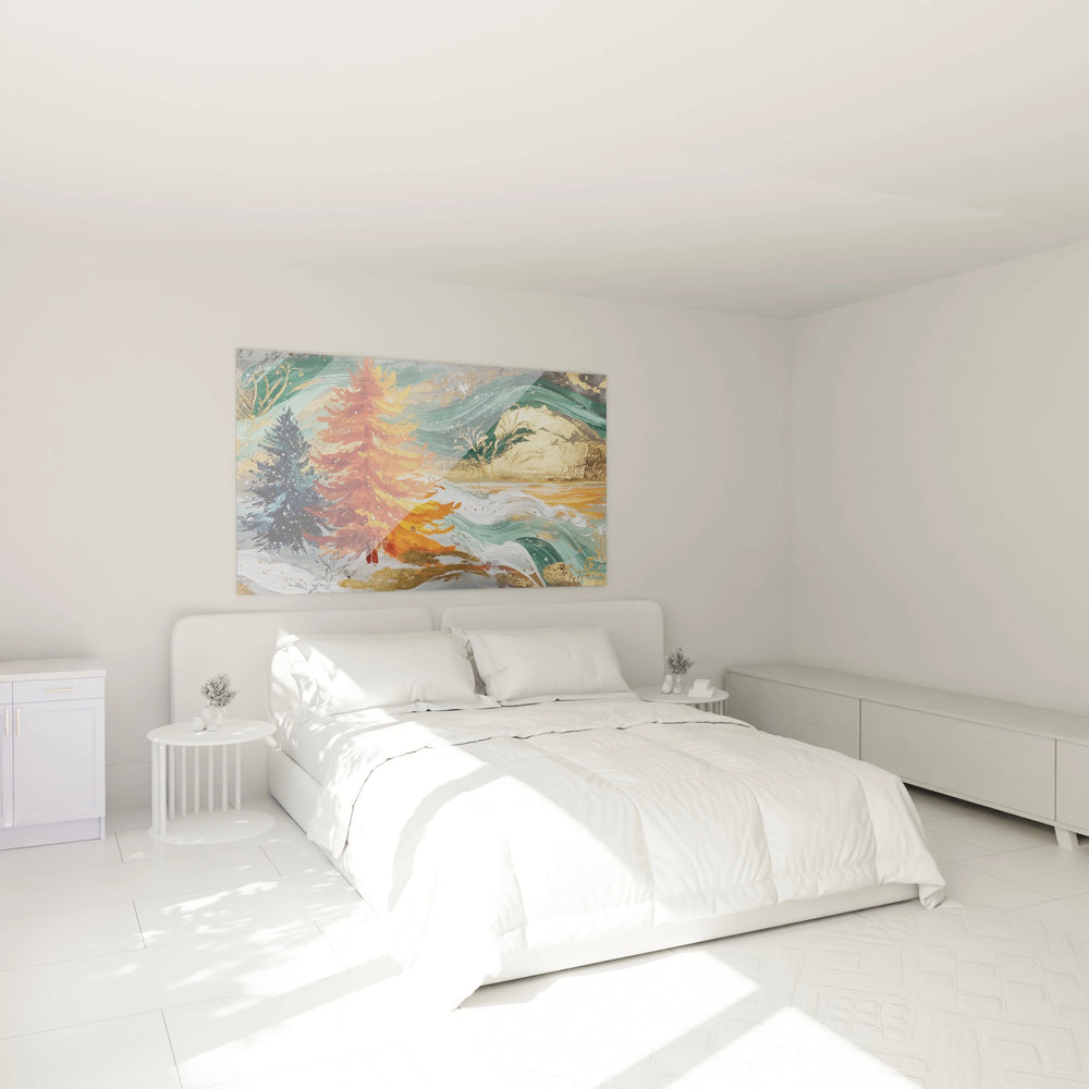 Cette harmonie chromatique crée une atmosphère à la fois chaleureuse et fraîche, faisant de ce tableau paysage contemporain une œuvre qui évoque parfaitement la magie de l'hiver.