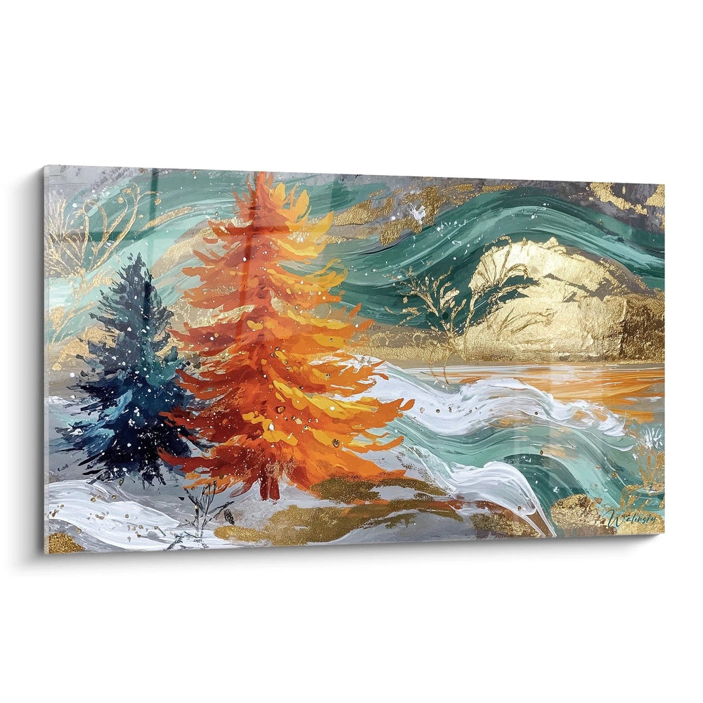 Ce tableau paysage captive immédiatement par son atmosphère hivernale féerique et sa palette chromatique exceptionnelle. L'œuvre révèle un paysage enneigé aux couleurs flamboyantes, où les tons orange et rouge ardents des sapins contrastent magnifiquement avec les nuances turquoise et bleu-vert de l'arrière-plan montagneux. Cette décoration murale paysage se distingue par ses effets de neige tourbillonnante et sa composition dynamique, où les touches dorées apportent une dimension magique à l'ensemble hivernal. Les détails texturés et les effets de matière créent une profondeur visuelle remarquable, faisant de ce tableau paysage hivernal une pièce d'exception qui évoque instantanément l'esprit de Noël et la magie de l'hiver.