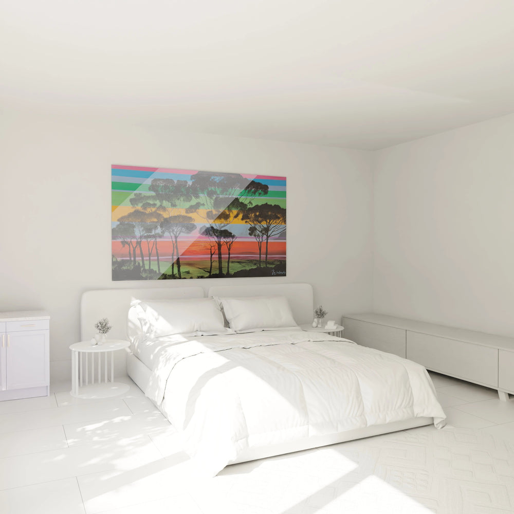 Ce tableau paysage contemporain se distingue par sa fusion innovante entre réalisme naturel et abstraction géométrique. L'unicité réside dans cette approche où les éléments organiques (arbres) dialoguent avec une structure chromatique artificielle. Cette œuvre paysage moderne transforme une scène pastorale traditionnelle en expérience visuelle contemporaine. Les caractéristiques impossibles à dupliquer incluent cette alternance précise de bandes colorées avec des arbres positionnés exactement aux intersections optimales. L'aspect visuel remarquable provient de cet effet stroboscopique créé par la répétition des rayures qui semble faire vibrer les silhouettes végétales. Cette approche artistique unique créé un nouveau langage visuel entre figuration et abstraction, rendant cette création totalement distinctive.