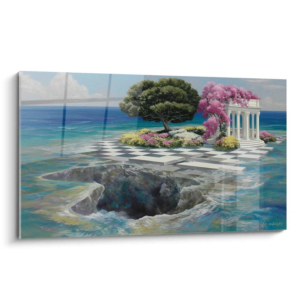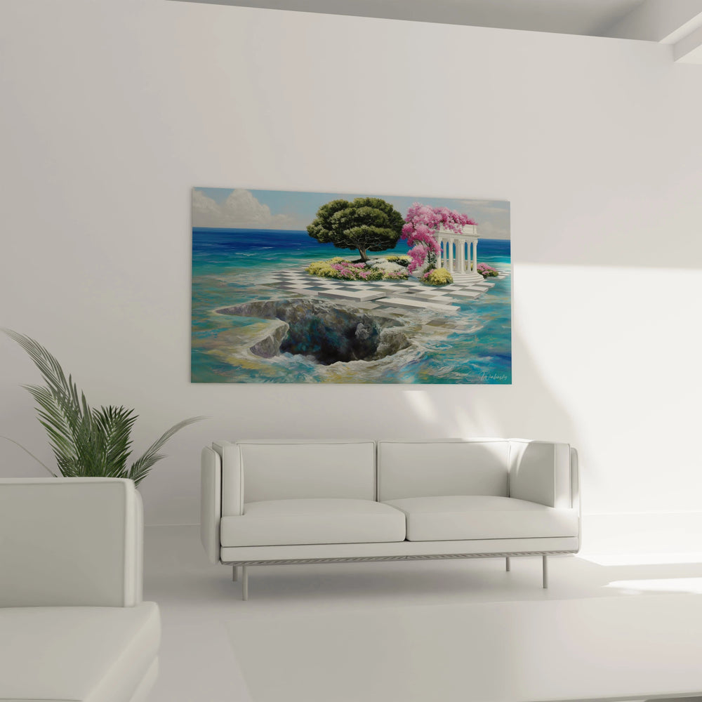 Ce tableau paysage surréaliste présente une vision onirique d'un temple grec perché sur un îlot rocheux au cœur d'un océan turquoise cristallin. L'œuvre capture immédiatement l'attention par son contraste saisissant entre l'architecture classique et l'environnement aquatique impossible. Un tableau paysage surréaliste temple grec d'une rare beauté, où les colonnes doriques se dressent majestueusement au-dessus des eaux translucides. L'élément le plus distinctif reste ce damier géométrique de marbre blanc et gris qui s'étend depuis le temple, créant une passerelle suspendue au-dessus du gouffre marin. Cette décoration murale paysage surréaliste transforme l'impossible en réalité visuelle.