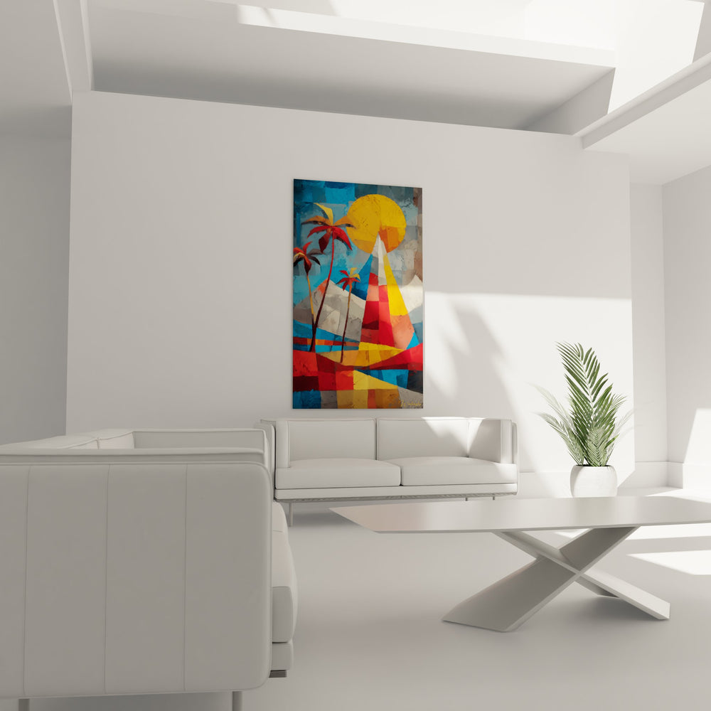Ce tableau mural tropical présente une interprétation moderne et géométrique d'un paysage paradisiaque. L'œuvre mélange habilement les codes du cubisme avec l'imagerie exotique, créant une composition où palmiers stylisés aux frondaisons colorées se dressent majestueusement. Le soleil abstrait géométrique domine la partie supérieure de la toile, représenté par un cercle jaune orangé aux facettes multiples qui évoque la chaleur tropicale. Un voilier cubiste coloré navigue sur des eaux fragmentées en blocs de couleurs vives, tandis que des montagnes blanches stylisées ferment l'horizon. Cette peinture moderne tropicale transforme les éléments naturels en formes géométriques audacieuses, où chaque plan coloré contribue à l'ensemble harmonieux. Les palmiers décoratifs abstraits aux tons rouge, jaune et brun créent un rythme vertical contrastant avec les lignes horizontales du paysage marin. L'artiste a su capturer l'essence de l'évasion tropicale tout en proposant une vision contemporaine et structurée de ce paradis imaginaire. Ce tableau décoratif exotique apporte une dimension poétique et moderne à l'art du paysage tropical.