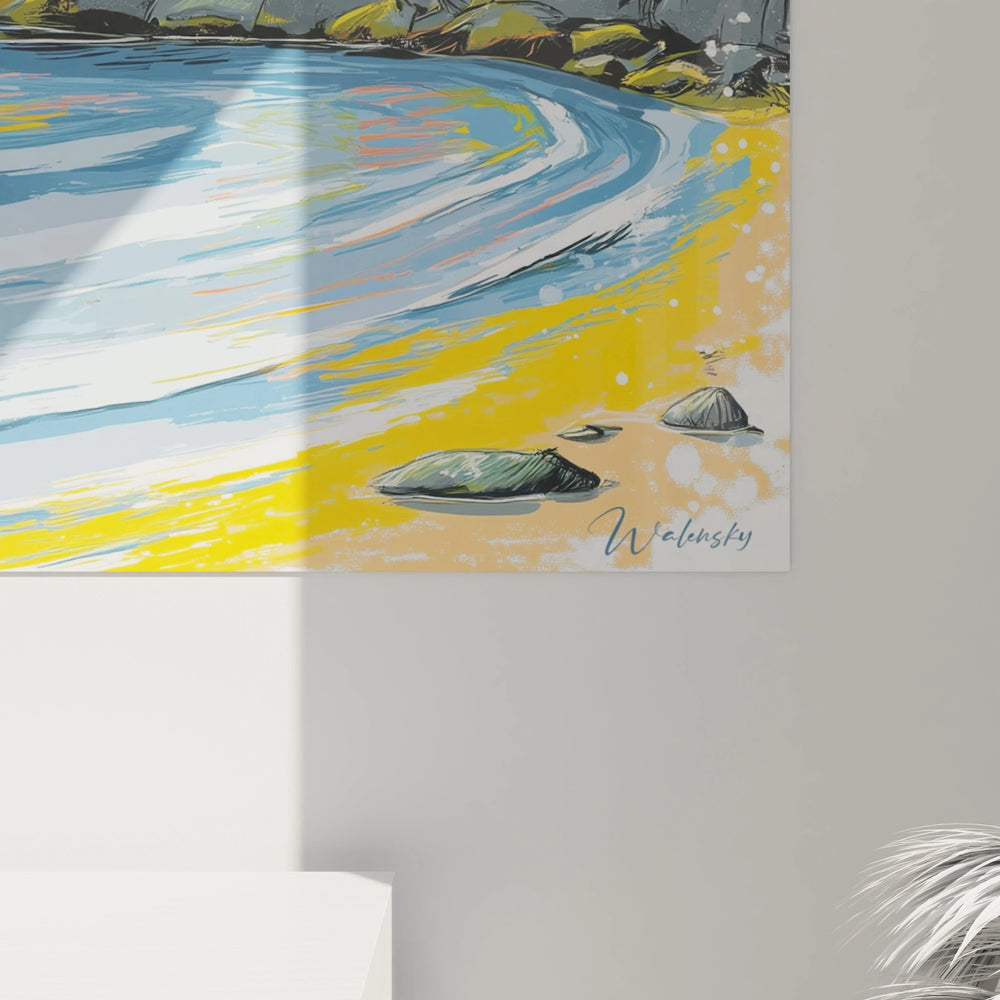 L'artiste a employé des techniques mixtes pour créer des effets de matière particulièrement réussis dans ce tableau paysage tropical contemporain. Les palmiers présentent des détails fins dans leurs palmes, avec des jeux d'ombre et de lumière qui leur donnent volume et réalisme. L'eau de mer est rendue par des touches fluides et ondoyantes, créant l'illusion du mouvement des vagues qui viennent caresser la plage dorée. Les rochers, traités avec des empâtements subtils, révèlent une texture rugueuse contrastant avec la douceur des éléments liquides. Les effets de lumière, particulièrement visibles sur les reflets solaires dans l'eau, témoignent d'une technique maîtrisée. Cette art mural tropical technique mixte combine harmonieusement précision du détail et expressivité gestuelle.