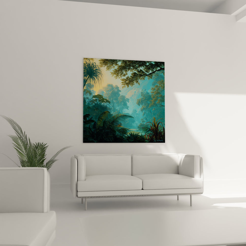 Ce tableau jungle exceptionnellement détaillé nous transporte au cœur d'un paysage tropical baigné d'une lumière dorée matinale. L'œuvre dépeint avec une précision saisissante la végétation luxuriante d'une forêt tropicale où se mêlent harmonieusement palmiers majestueux, fougères arborescentes et plantes exotiques aux formes sculpturales. Au premier plan, des palmiers géants déploient leurs frondes élégantes, créant un rideau naturel qui encadre la scène. La canopée jungle s'étend vers l'horizon dans un dégradé de verts profonds et de bleus turquoise, suggérant la profondeur infinie de cette forêt primaire. Les rayons du soleil percent à travers le feuillage dense, créant des jeux d'ombres et de lumières qui donnent vie à ce tableau mural jungle. Cette décoration murale tropicale capture parfaitement l'essence mystique et sereine d'un écosystème préservé, où chaque détail de la flore révèle la richesse extraordinaire de la biodiversité tropicale. L'artiste a su recréer l'atmosphère humide et vaporeuse caractéristique de ces environnements, où la nature sauvage exotique règne en maître absolu.