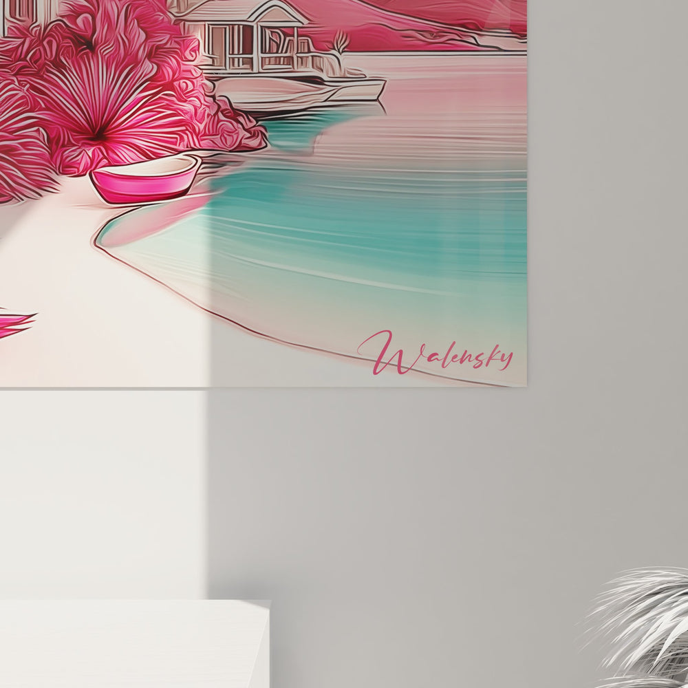 La palette rose tropicale de cette œuvre évoque la douceur d'un coucher de soleil sur les îles paradisiaques. Les teintes corail et magenta symbolisent la passion et la chaleur humaine, while le turquoise de l'eau apporte fraîcheur et tranquillité. Cette harmonie chromatique unique transforme ce tableau mural exotique en véritable source de bien-être et d'évasion mentale, parfait pour créer une ambiance relaxante et inspirante.