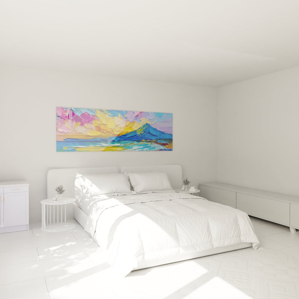 La palette chromatique de ce tableau volcan abstrait mélange harmonieusement les tons chauds et froids pour créer un équilibre visuel parfait. Les jaunes éclatants et les roses vibrants évoquent la chaleur intense du magma, tandis que les bleus profonds représentent la sérénité contrastante du ciel et de l'océan. Cette décoration murale volcanique symbolise la dualité entre destruction et création, incarnant parfaitement la philosophie de renouvellement perpétuel de la nature.