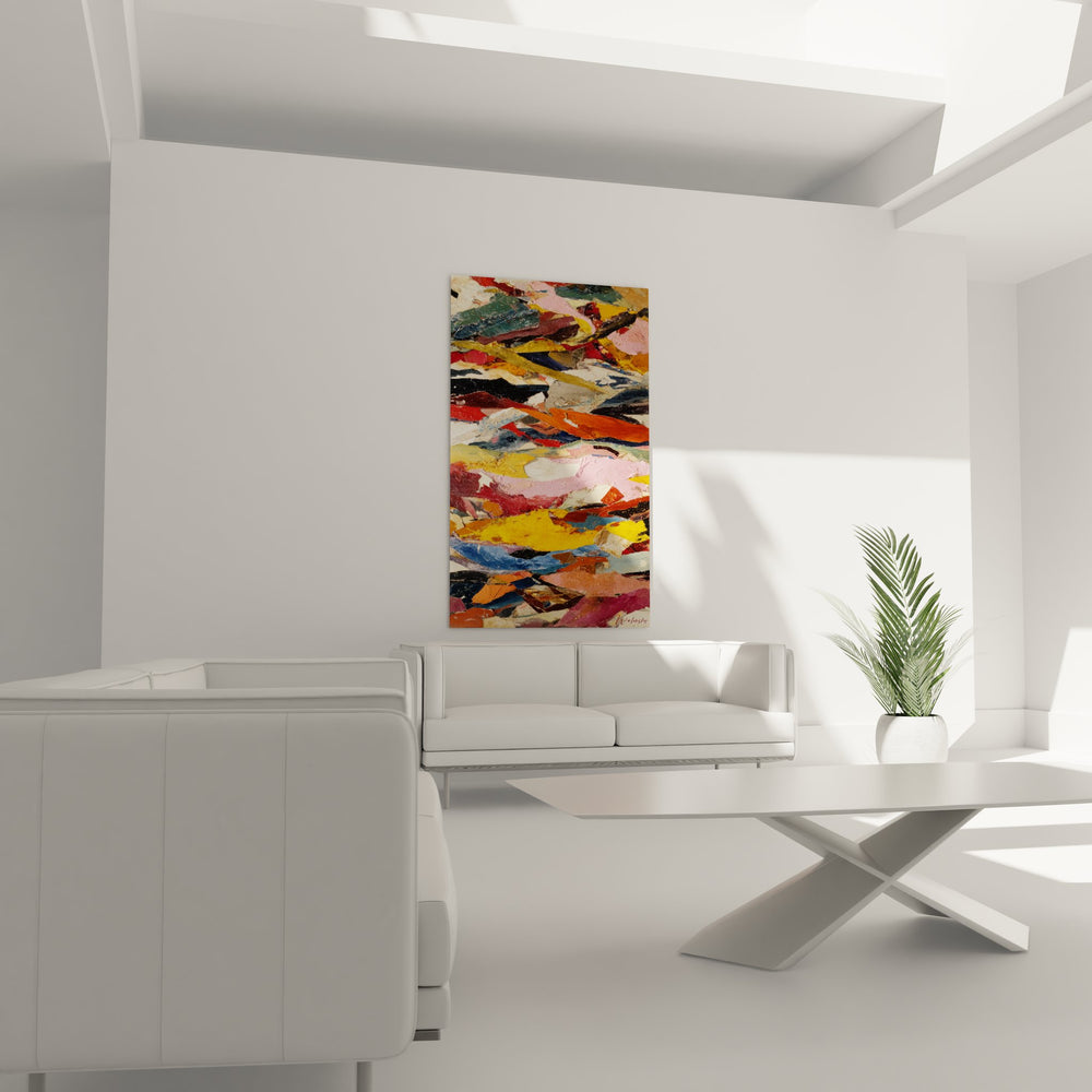 Ce tableau mural abstrait présente une composition dynamique de formes géométriques fragmentées qui s'entremêlent dans un ballet visuel captivant. L'œuvre révèle une technique de peinture abstraite moderne où les couleurs se superposent en couches texturées, créant une profondeur remarquable. Les tons dominants oscillent entre des jaunes éclatants, des roses poudrés, des bleus profonds et des oranges vibrants, ponctués de touches de blanc et de noir qui structurent l'ensemble. Cette création artistique contemporaine évoque un paysage mental fragmenté, où chaque forme colorée raconte une histoire différente. Les coups de pinceau visibles témoignent de la gestuelle de l'artiste, apportant une dimension émotionnelle forte à cette œuvre d'art murale. La composition non figurative invite le spectateur à une interprétation personnelle, caractéristique de l'art abstrait expressionniste. Les transitions chromatiques fluides et les contrastes marqués créent un mouvement perpétuel qui anime ce tableau décoratif moderne, parfait pour dynamiser un intérieur contemporain.