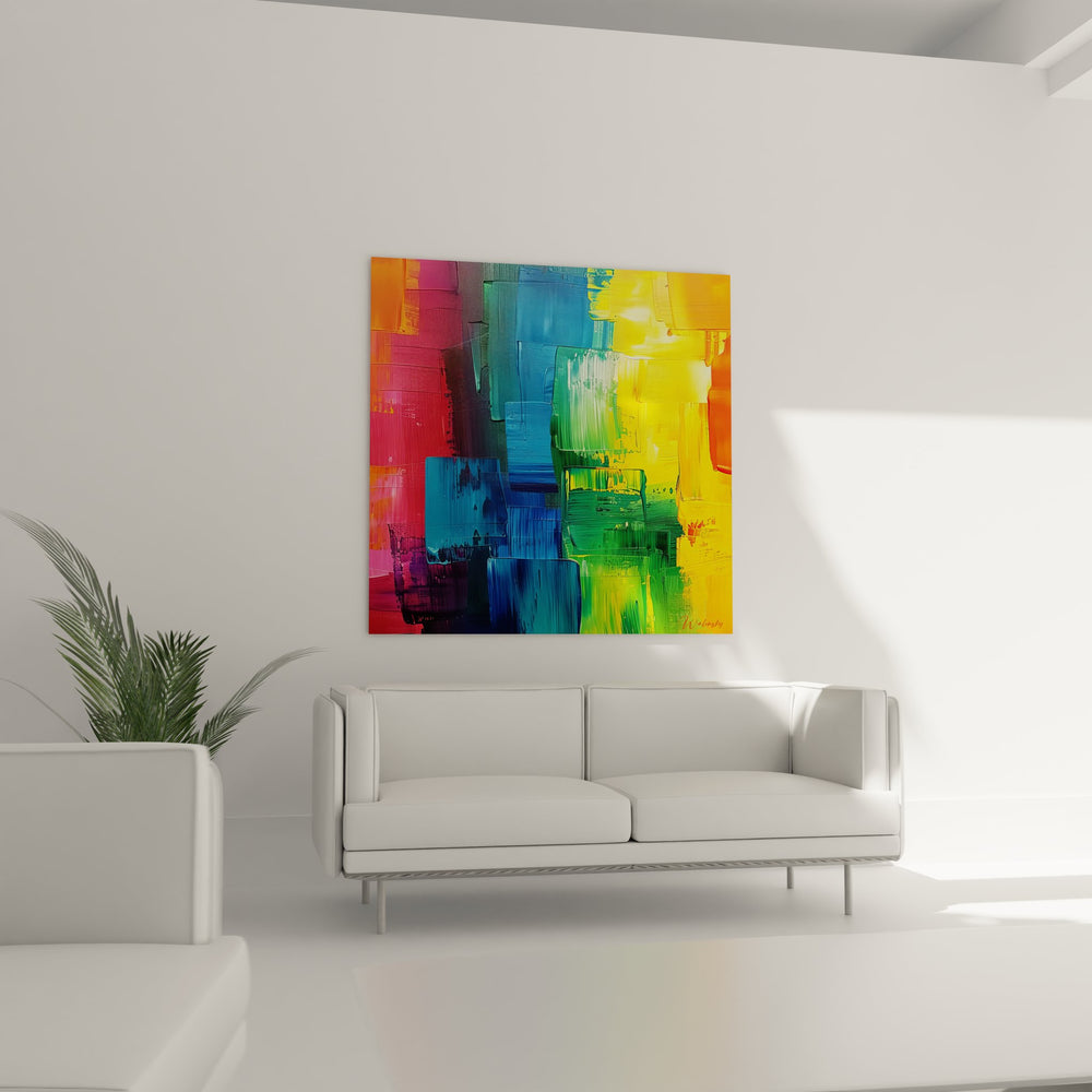 Ce tableau mural abstrait présente une composition dynamique où les couleurs se mélangent et s'entrechoquent dans un ballet visuel saisissant. La peinture abstraite moderne révèle un spectre chromatique complet, allant des rouges incandescents aux oranges chaleureux, en passant par les jaunes éclatants, les verts profonds, les bleus océaniques et les violets mystérieux. Les couleurs vives abstraites sont appliquées par couches successives, créant des effets de transparence et d'opacité qui donnent une profondeur remarquable à l'œuvre. Les coups de pinceau expressifs et les textures variées témoignent d'une technique picturale maîtrisée, où chaque zone colorée dialogue avec ses voisines. Cette toile contemporaine multicolore évoque un paysage émotionnel où les sensations se transforment en couleurs pures. L'art mural décoratif proposé ici transcende la simple représentation pour offrir une expérience esthétique immersive. Les transitions chromatiques fluides créent un mouvement perpétuel qui capte le regard et invite à la contemplation. Cette œuvre d'art moderne s'inscrit parfaitement dans les tendances actuelles de la décoration intérieure, apportant énergie et caractère à tout espace de vie.