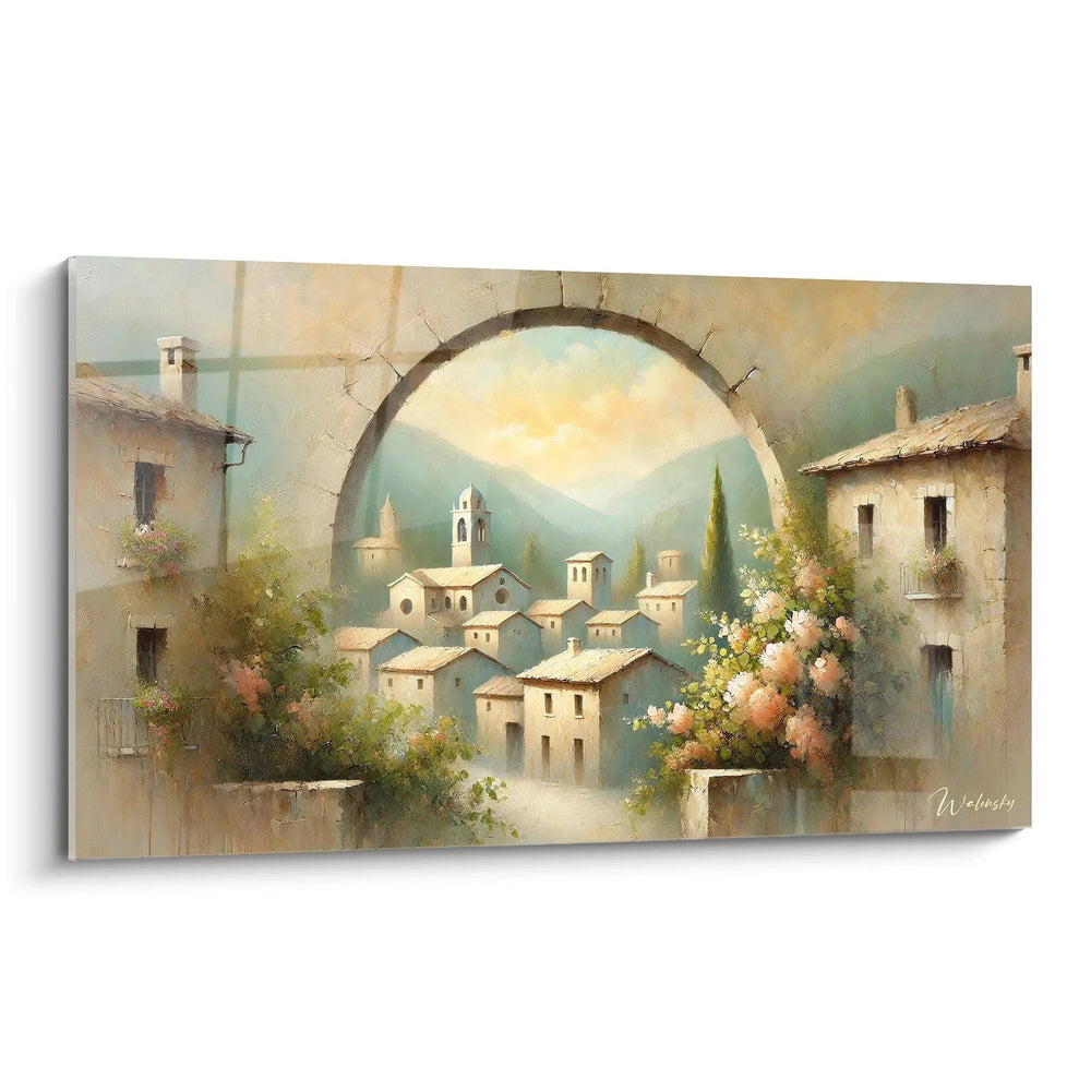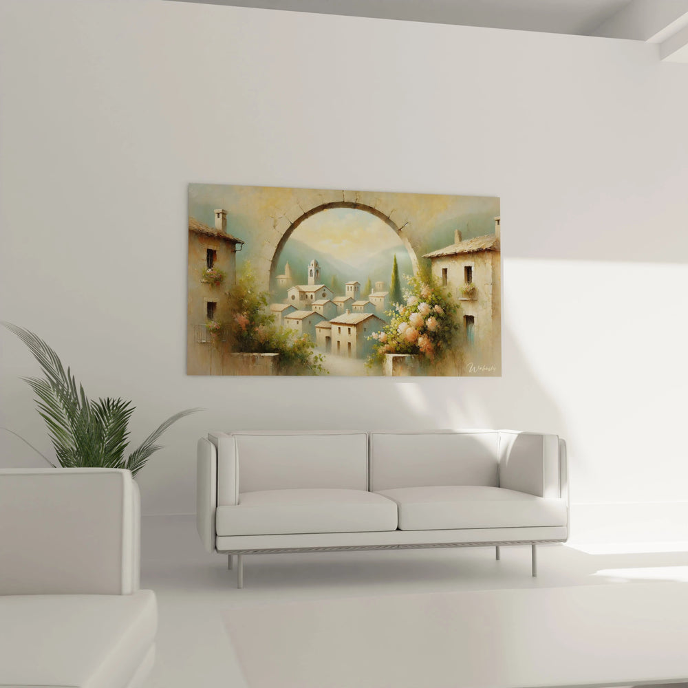 Imaginez-vous franchissant une arche de pierre ancienne, porte d’entrée vers un village côtier baigné de lumière douce, où chaque ruelle invite à la sérénité. Ce tableau unique capture avec grâce cette atmosphère chaleureuse, typique des paysages méditerranéens où la nature se mêle à l’architecture avec harmonie.