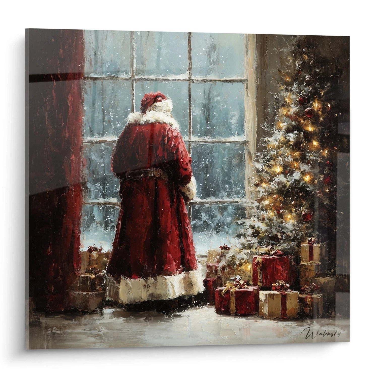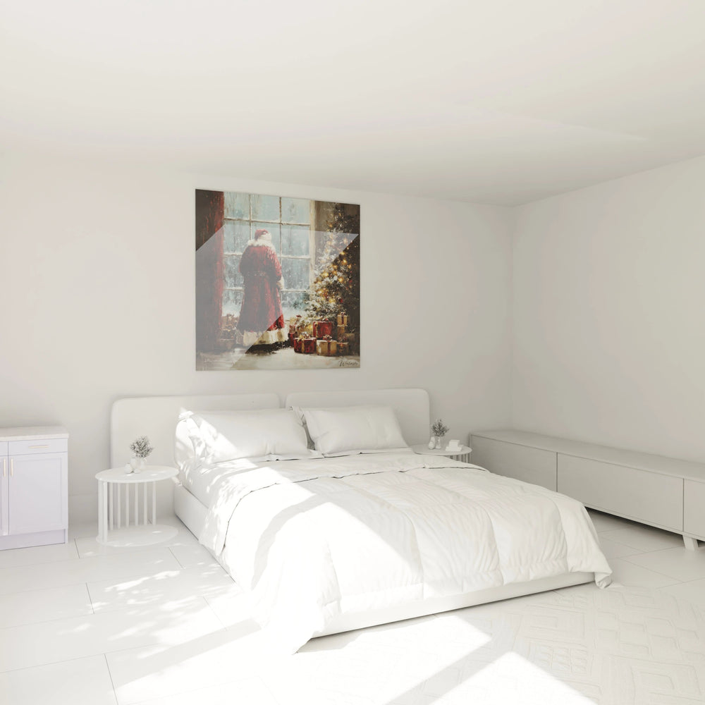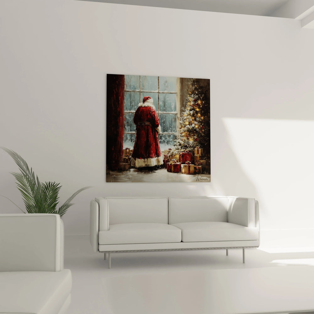 Ce tableau Père Noël contemplatif capture un moment d'une intimité saisissante où le personnage emblématique de Noël se tient devant une fenêtre enneigée. L'œuvre révèle le Père Noël de dos, dans son costume rouge traditionnel orné de fourrure blanche, créant une scène d'une profonde mélancolie festive. La décoration murale Père Noël présente une composition verticale où le personnage principal occupe le centre-gauche du cadre, créant un équilibre parfait avec l'arbre de Noël illuminé à droite. Les flocons de neige qui tombent derrière la vitre apportent une dimension poétique à cette œuvre Père Noël méditative, tandis que les cadeaux colorés disposés au sol complètent l'atmosphère chaleureuse de cette scène domestique exceptionnelle.