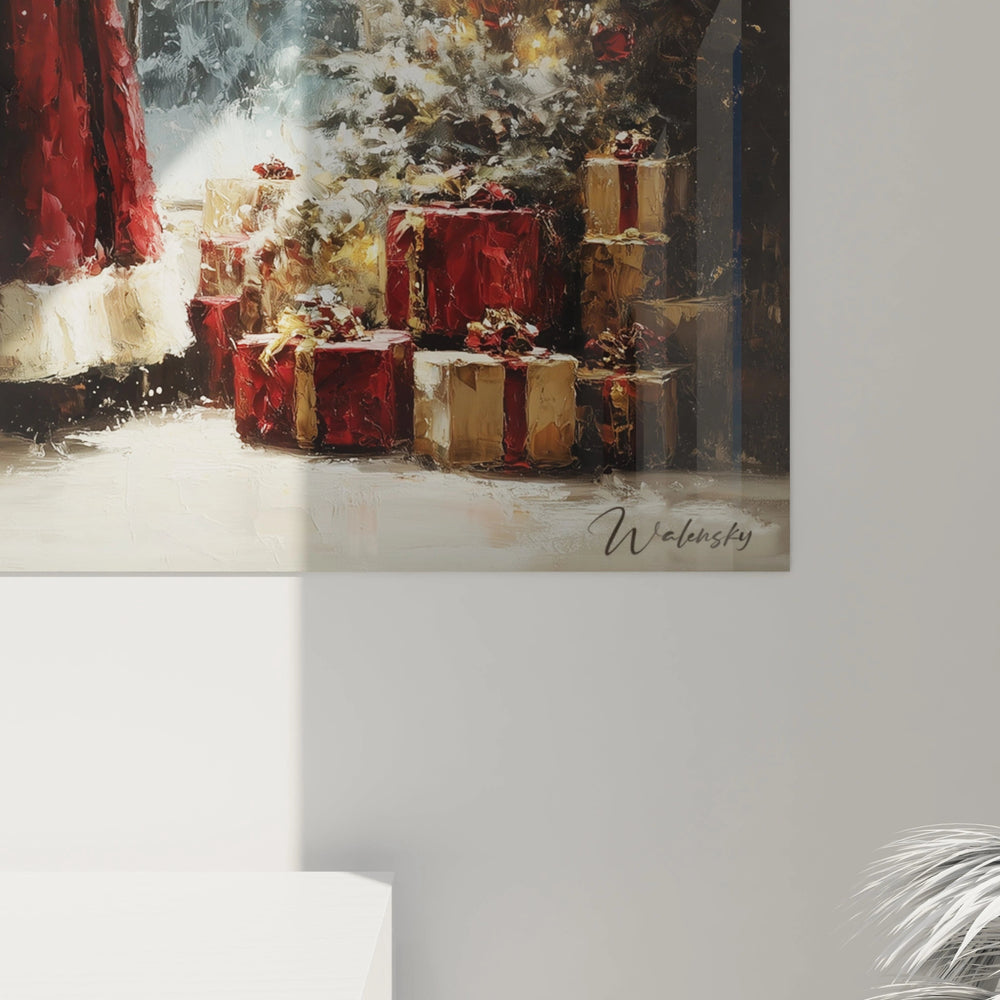 La composition s'articule autour d'un axe vertical central qui guide naturellement le regard vers le personnage principal. Le tableau Père Noël intérieur chaleureux exploite intelligemment la règle des tiers, plaçant le Père Noël légèrement décentré pour créer un dynamisme visuel subtil. La fenêtre à carreaux forme un cadre dans le cadre, encadrant parfaitement la silhouette du personnage et créant une profondeur remarquable. L'arbre de Noël, positionné dans le coin droit, équilibre la composition grâce à ses lumières dorées qui font écho aux reflets de la fenêtre. Les lignes directrices convergent naturellement vers la figure centrale, créant une perspective intime qui invite à la contemplation. Cette art mural Père Noël démontre une maîtrise parfaite de l'espace et des proportions.
