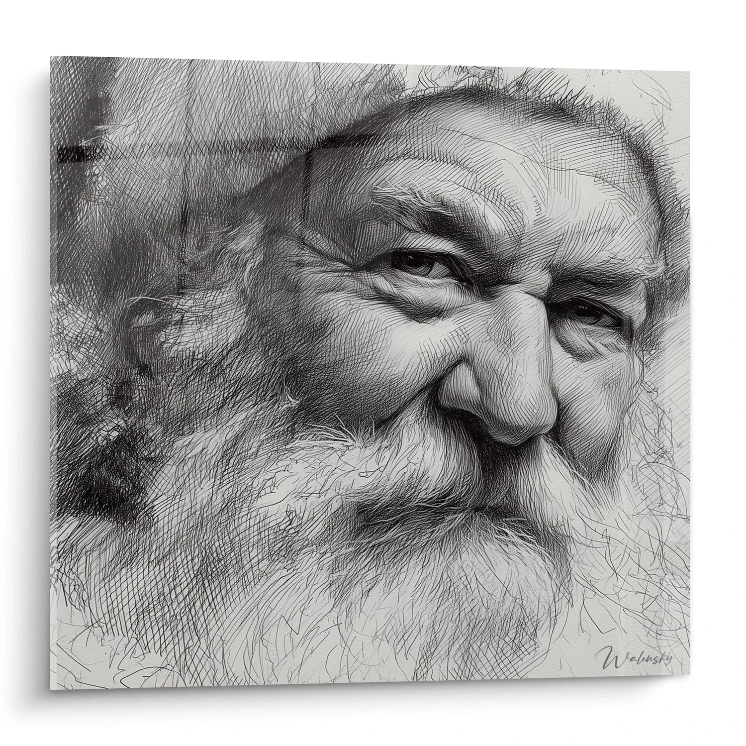 Ce tableau Père Noël révèle un portrait saisissant du légendaire personnage de Noël, capturé dans un style de dessin au crayon d'une finesse remarquable. L'œuvre présente le visage souriant et bienveillant du Père Noël avec sa barbe blanche caractéristique, ses yeux pétillants et son expression chaleureuse. Cette décoration murale Père Noël se distingue par son approche artistique raffinée, utilisant exclusivement les nuances de gris et de noir pour créer une profondeur exceptionnelle. Le tableau Père Noël souriant transmet immédiatement une sensation de joie et de bienveillance, caractéristiques essentielles du personnage mythique des fêtes de fin d'année.