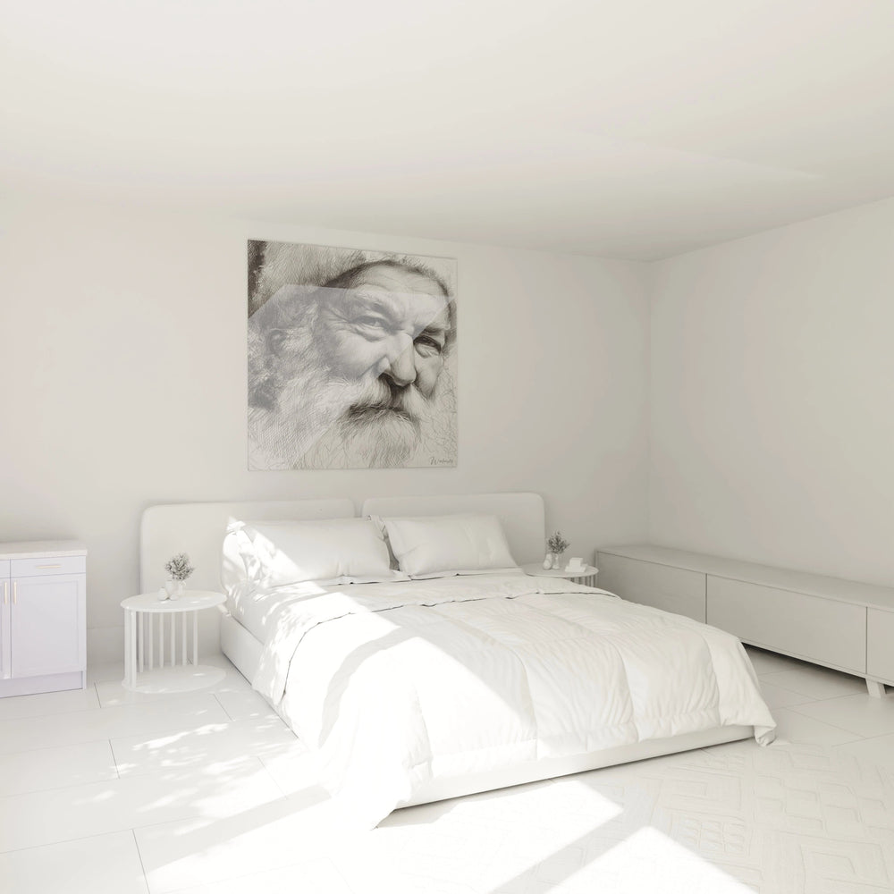 La composition de cette œuvre place le visage du Père Noël légèrement décentré vers la droite, créant un équilibre visuel dynamique. Le tableau Père Noël portrait classique utilise une perspective frontale qui permet une connexion directe avec le regardeur. Les lignes directrices convergent naturellement vers les yeux du personnage, points focaux de l'ensemble. L'espace est utilisé de manière optimale, avec la barbe qui occupe la partie inférieure du cadre, créant une base solide à la composition. Cette art mural Père Noël démontre une maîtrise parfaite des proportions, respectant l'anatomie du visage tout en accentuant les traits caractéristiques du personnage légendaire.