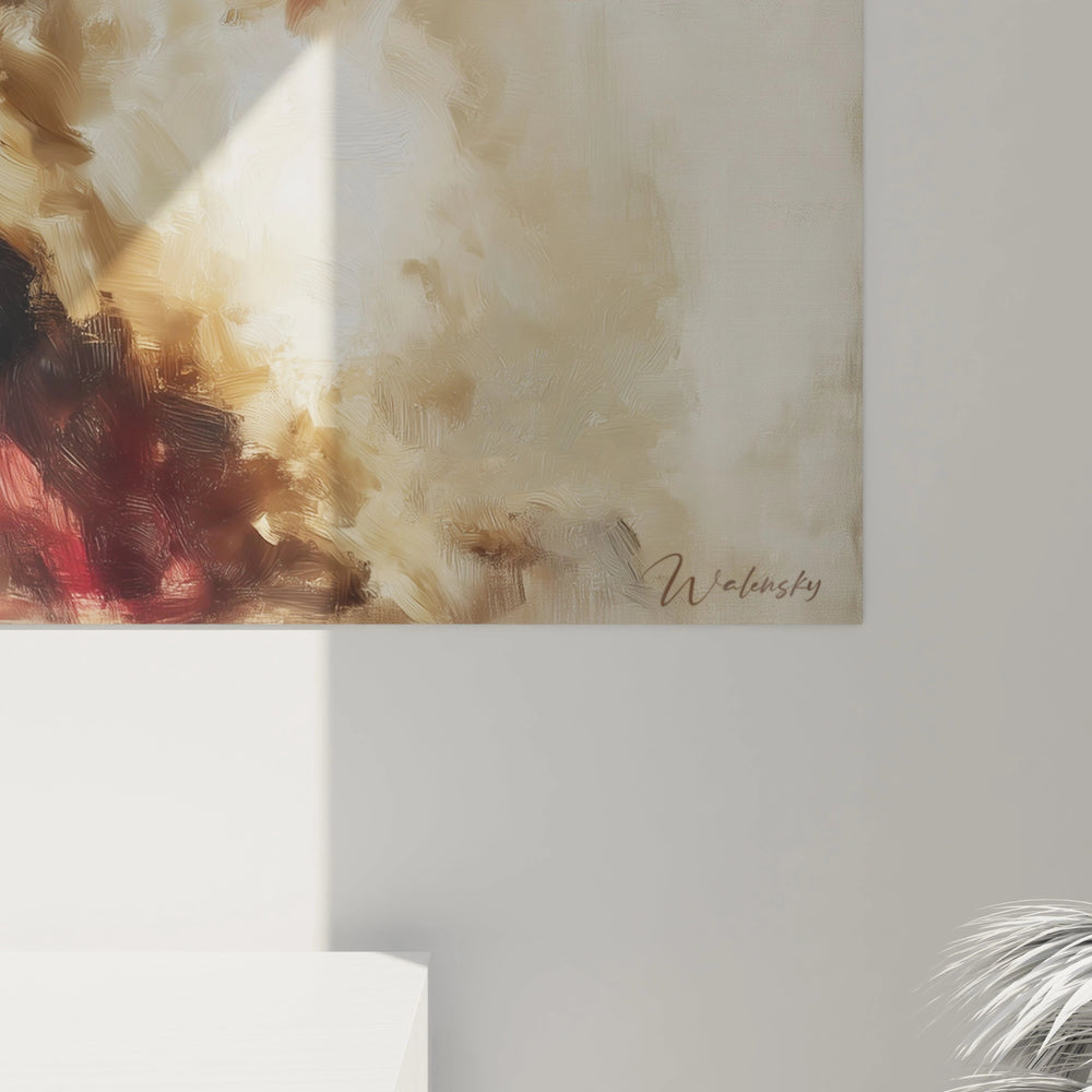 La composition de ce tableau Père Noël privilégie un cadrage serré sur le visage, créant une intimité remarquable avec le spectateur. Le personnage est positionné légèrement de trois-quarts, permettant d'admirer à la fois le profil noble et l'expression faciale. L'artiste a choisi de centrer le bonnet rouge dans la partie supérieure gauche, créant un équilibre visuel dynamique. La décoration murale Père Noël composition utilise un format carré qui concentre l'attention sur l'essentiel. Les proportions respectent parfaitement l'anatomie du visage, avec une attention particulière portée aux détails expressifs comme les rides de sourire. Le cadrage rapproché de ce tableau Père Noël technique moderne élimine toute distraction pour se focaliser sur la force émotionnelle du personnage. La perspective légèrement plongeante confère une dimension majestueuse au sujet principal.