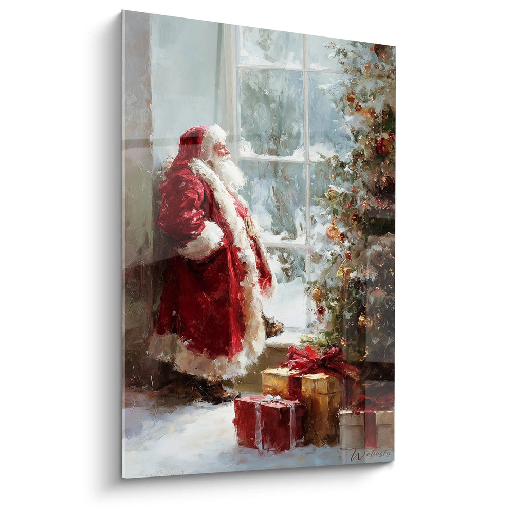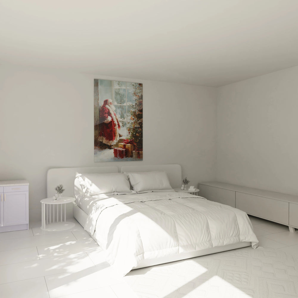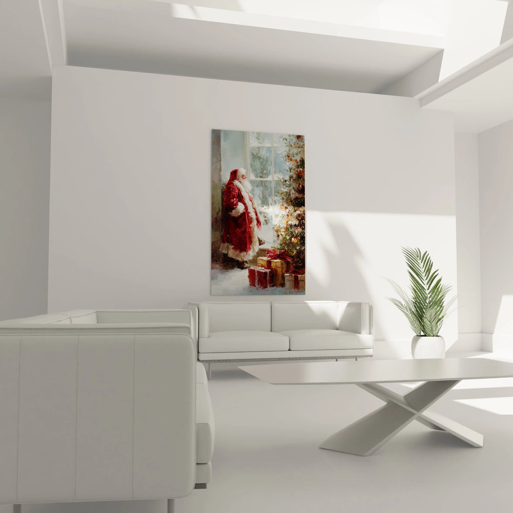 Cette œuvre se distingue par sa capacité à capturer l'essence contemplative de Noël plutôt que son aspect festif habituel. Le Père Noël n'est pas représenté en action, distribuant des cadeaux, mais dans un moment d'introspection silencieuse qui humanise profondément le personnage mythique. L'angle de vue choisi, légèrement en plongée, crée une intimité particulière avec le spectateur. Les détails uniques incluent les traces de pas subtiles dans la neige visible par la fenêtre, les reflets complexes des ornements qui créent des jeux de lumière kaléidoscopiques, et la manière dont la lumière hivernale filtrée éclaire délicatement le profil du personnage. Cette art mural Père Noël style contemplatif possède une dimension spirituelle rare qui transcende la simple représentation festive pour atteindre une véritable méditation sur l'esprit de Noël.