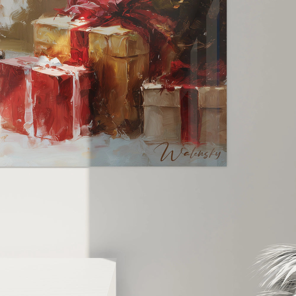 La composition de cette œuvre révèle un équilibre subtil entre plusieurs éléments architecturaux et décoratifs. Le Père Noël occupe le tiers gauche de la toile, positionne de profil dans une pose méditative qui guide naturellement le regard vers l'extérieur. La fenêtre à croisillons blancs structure verticalement l'espace, créant un cadre naturel qui sépare l'intérieur chaleureux de l'extérieur hivernal. Le sapin de Noël, richement décoré, équilibre la composition sur la droite avec ses ornements scintillants et ses guirlandes lumineuses. Les paquets cadeaux disposés au sol forment une base triangulaire stable qui ancre visuellement l'ensemble. Cette art mural Père Noël exploite magistralement la règle des tiers, plaçant les éléments clés aux intersections stratégiques pour créer une dynamique visuelle naturelle et apaisante.