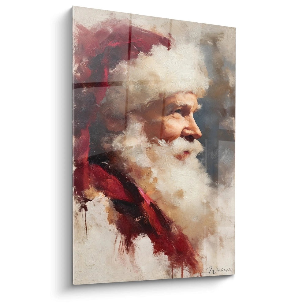 La composition de cette œuvre s'articule autour d'un cadrage en profil trois-quarts qui place le visage du père Noël légèrement décalé vers la gauche du tableau. Cette décoration murale père noël utilise une perspective rapprochée qui élimine tout élément de distraction pour se concentrer sur l'essentiel : l'expression du personnage. L'équilibre visuel repose sur le contraste entre les masses colorées du bonnet rouge et de la barbe blanche. Les lignes directrices convergent naturellement vers le regard du père Noël, créant un point focal puissant. L'espace négatif du fond permet au sujet principal de se détacher avec élégance, renforçant l'impact émotionnel de ce tableau père noël technique moderne.
