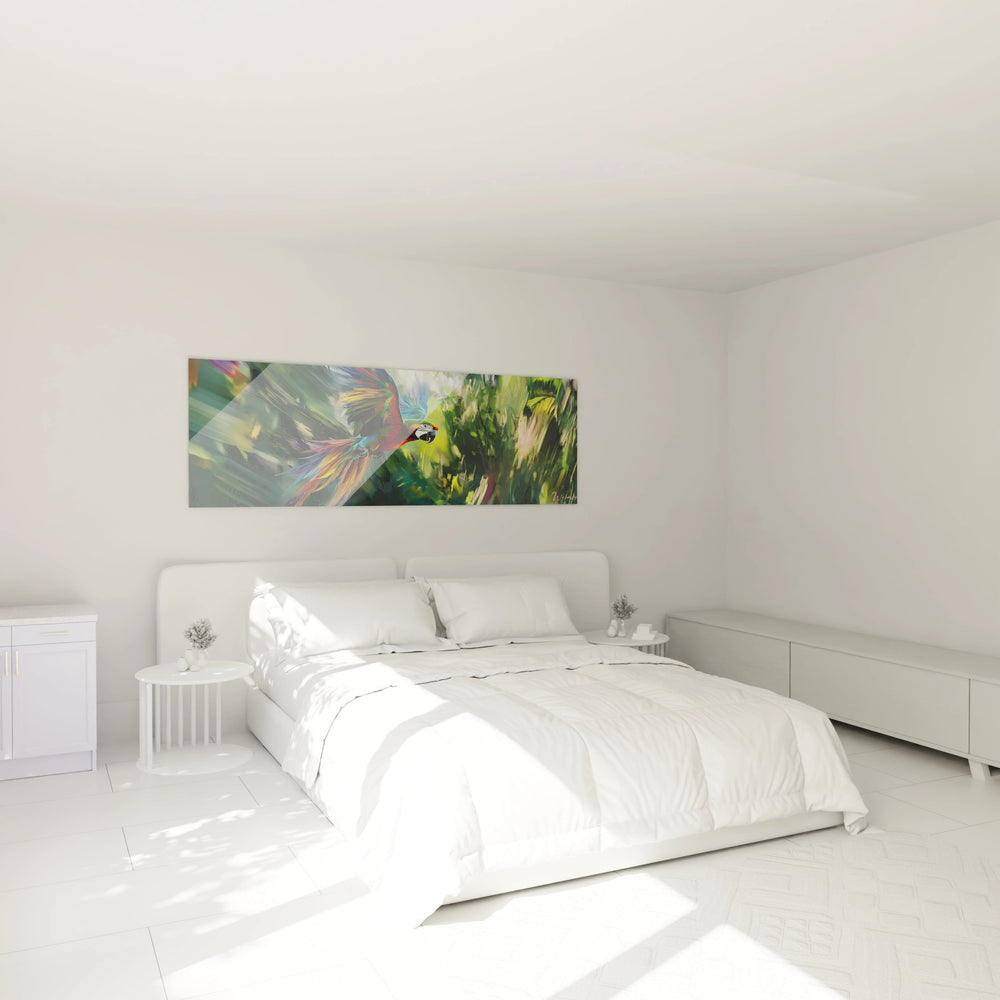La composition de ce tableau perroquet tropical place le sujet principal légèrement décentré vers la droite, créant un équilibre dynamique parfait. Les ailes étendues forment une diagonale puissante qui guide naturellement le regard à travers l'ensemble de l'œuvre. L'arrière-plan forestier occupe les deux tiers de l'espace, offrant un contexte naturel sans jamais concurrencer la présence majestueuse du volatile. Cette art mural perroquet exploite brillamment la règle des tiers pour créer une harmonie visuelle où chaque élément trouve sa place idéale. La perspective légèrement en plongée accentue l'impression de vol libre et renforce l'impact émotionnel de cette œuvre exceptionnelle.