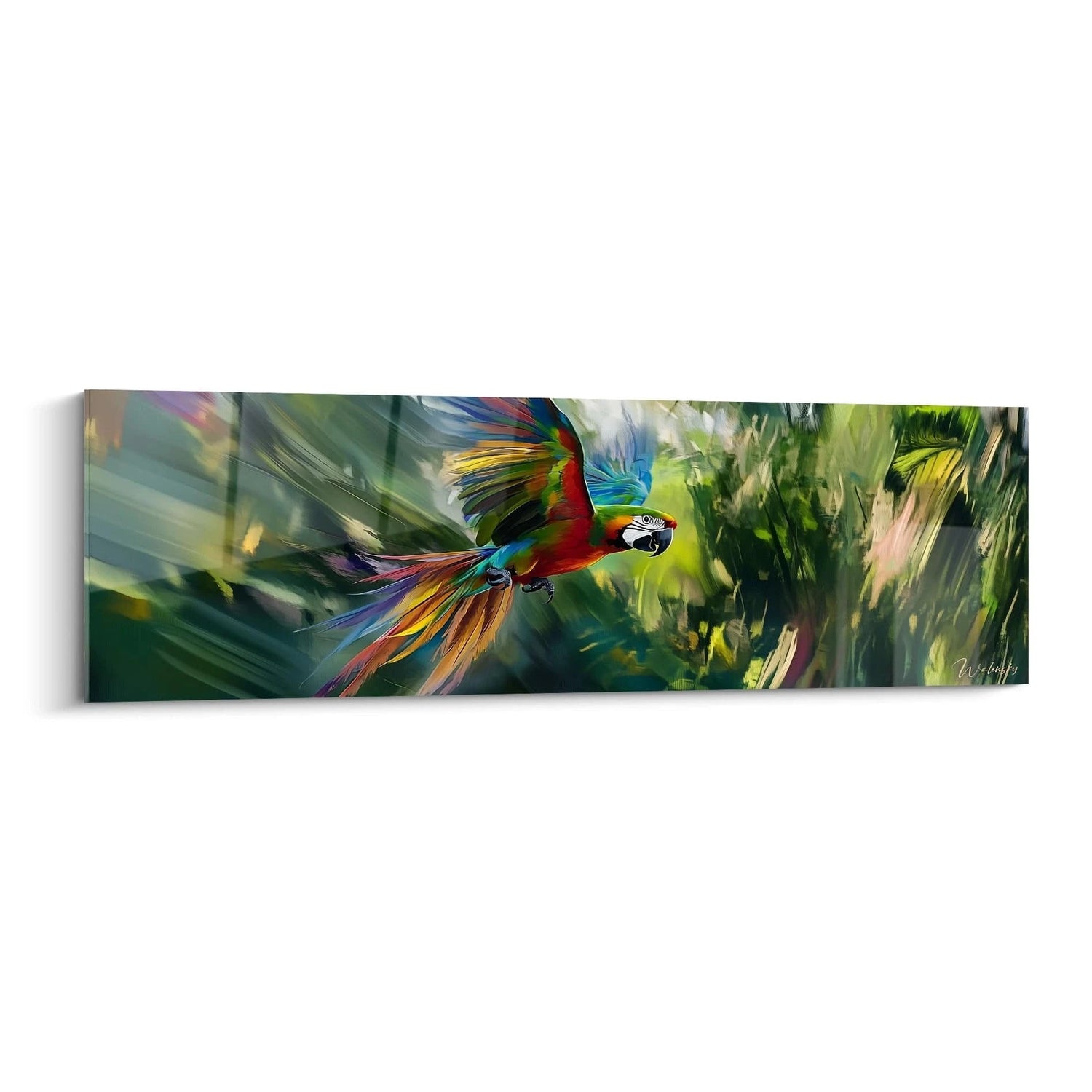 Ce tableau perroquet présente un ara aux couleurs flamboyantes capturé dans un moment de vol majestueux au cœur d'une forêt tropicale luxuriante. L'œuvre révèle immédiatement sa force visuelle par l'intensité chromatique du plumage qui contraste magnifiquement avec l'arrière-plan végétal flou. Le tableau perroquet multicolore dégage une énergie dynamique grâce à l'effet de mouvement créé par les ailes déployées et la technique de flou artistique appliquée à l'environnement. Cette décoration murale perroquet se distingue par sa capacité à transformer instantanément l'atmosphère d'un espace grâce à ses couleurs vibrantes et son format panoramique élégant.